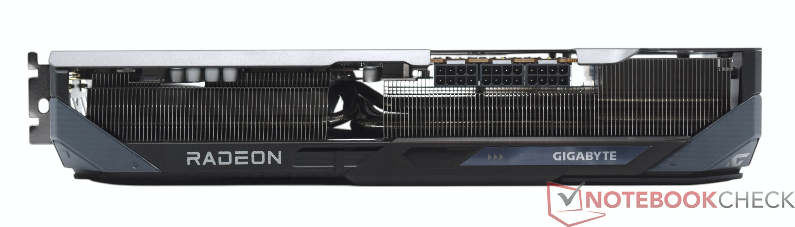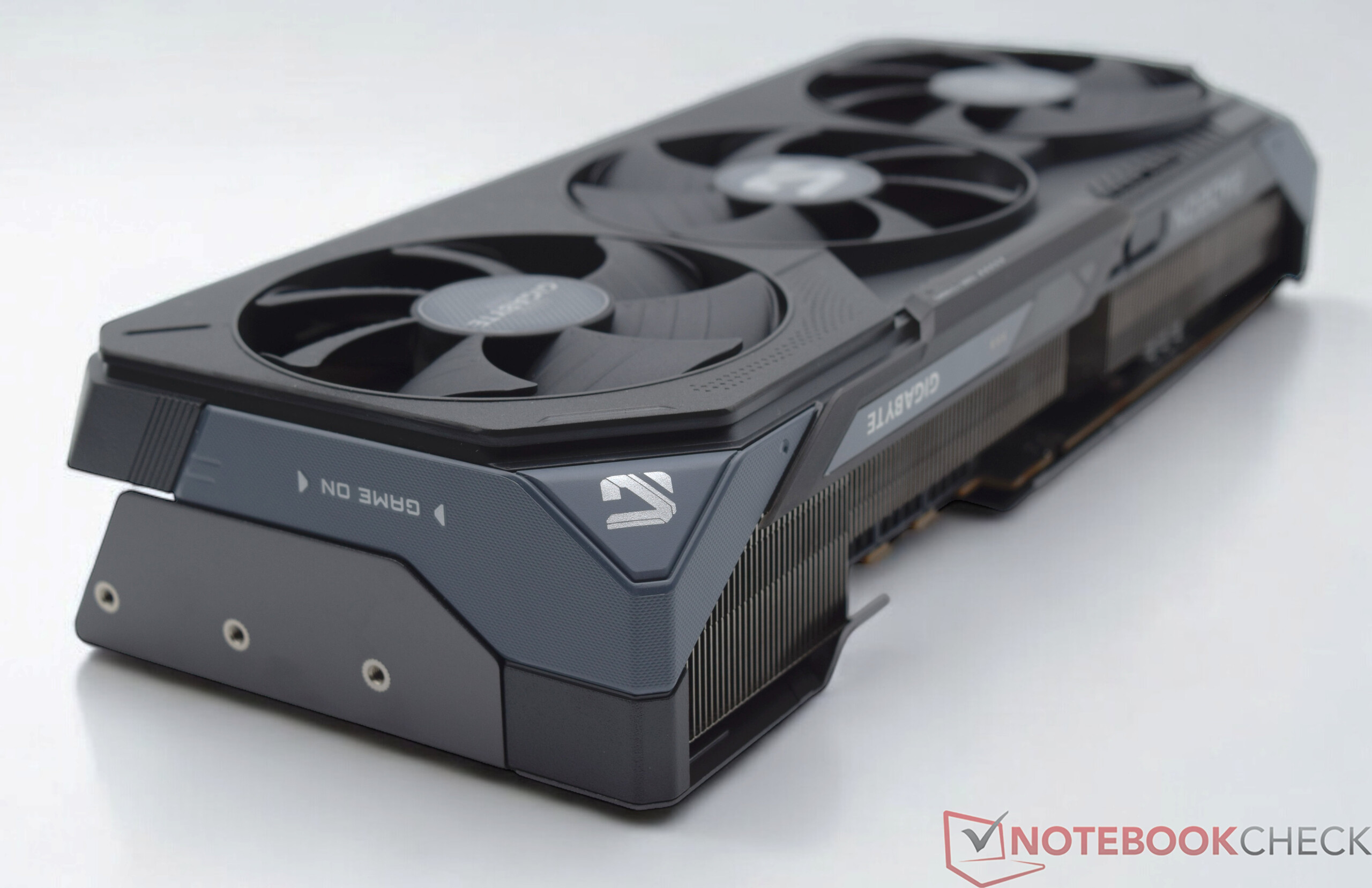 La Gigabyte Radeon RX 9070 Gaming OC también se basa en un diseño de triple ventilador, aunque su disipador térmico y la estructura de sus aletas son más compactos que en el modelo XT, un ajuste sensato en vista de su menor consumo energético. Esto también se hizo notar durante las mediciones del nivel de ruido: Bajo carga, su desarrollo de ruido se mantuvo notablemente más bajo. En una configuración abierta, medimos un nivel de presión sonora de sólo 34,5 dB(A), un resultado excelente para una tarjeta gráfica potente.