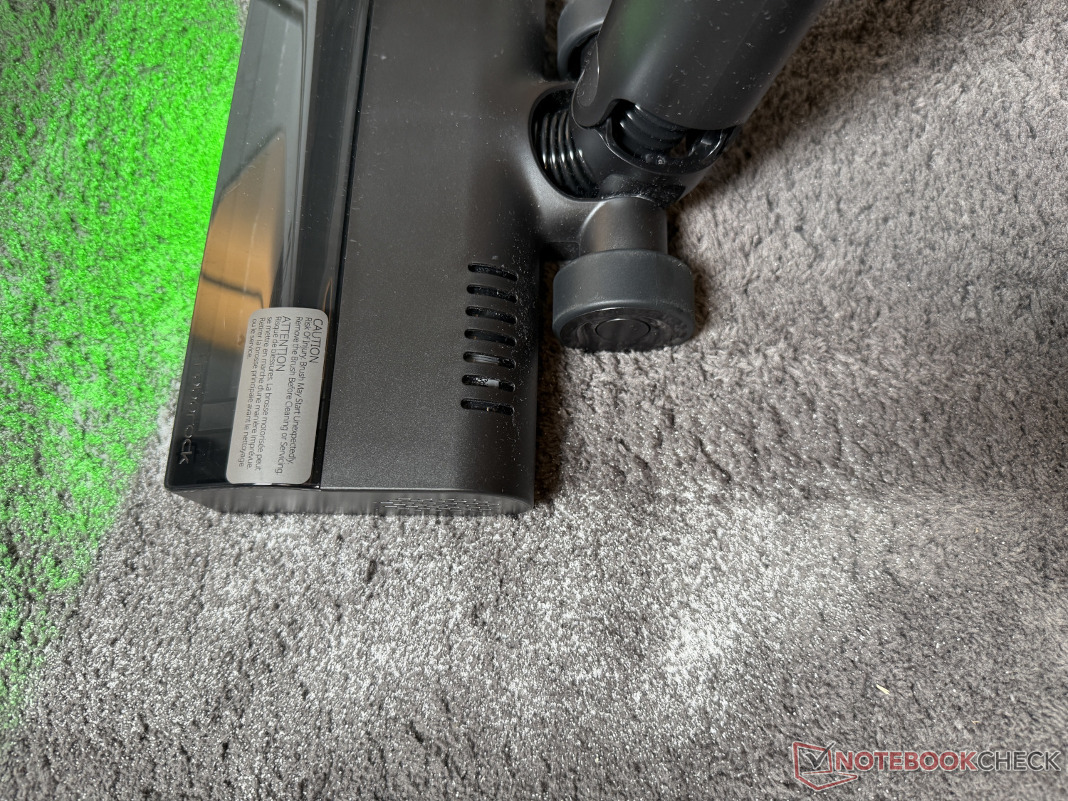 Sujetar el aparato resulta más fácil porque no es necesario pulsar permanentemente ningún botón con el dedo para que el aspirador sin cable aspire. En su lugar, se enciende mediante un botón situado en la parte superior de la pantalla. Un segundo botón sirve para cambiar entre los tres niveles de potencia. Durante el uso, sin embargo, éstos son difíciles de alcanzar con la mano de sujeción (incluso con una mano grande), por lo que se requiere la segunda mano. Por desgracia, no hay ajuste automático de la potencia de succión (por ejemplo, para alfombras).