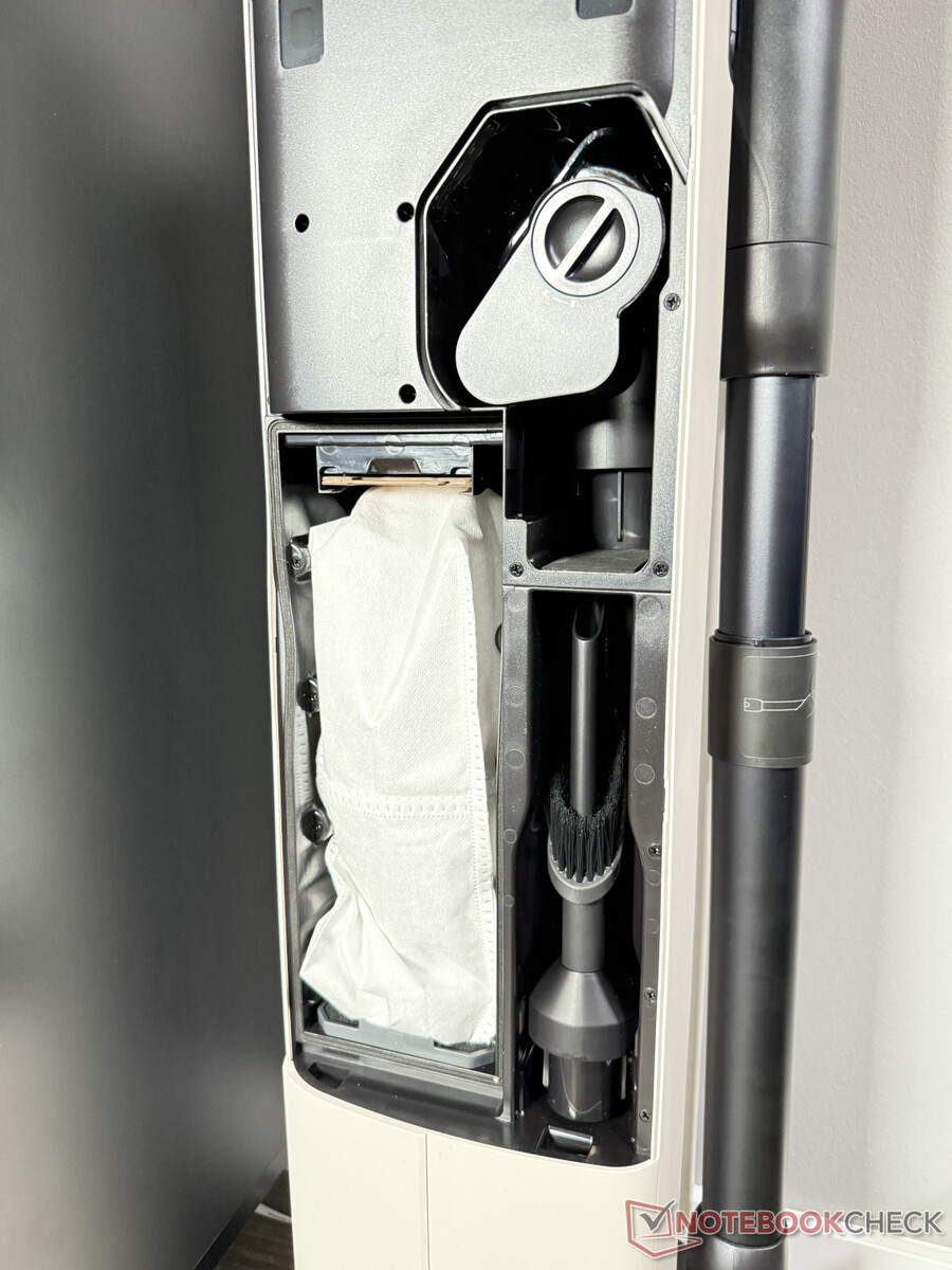 Para acceder a la bolsa, hay que retirar un panel magnético situado en el lado izquierdo de la estación. Lamentablemente, no se abre como una puerta, pero la tiene en la mano. Además de la bolsa para el polvo, también hay espacio para dos de los accesorios suministrados: el minicepillo motorizado y el cepillo para hendiduras 2 en 1. Esto significa que los accesorios están siempre en su sitio.