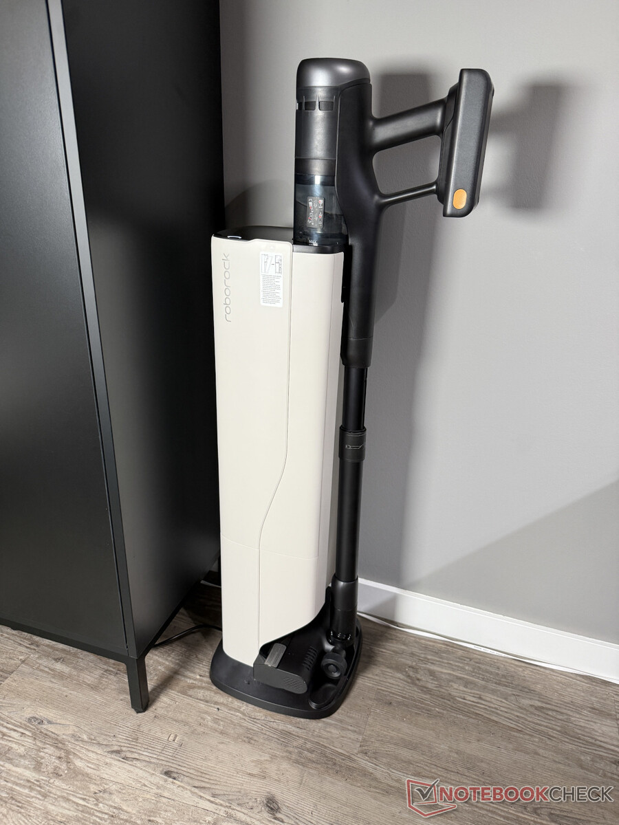 El peso de la aspiradora sin cable con tubo telescópico y cepillo para suelos es de unos 3 kg, incluida la batería sustituible (el bloque motor con la batería pesa alrededor de 1,8 kg). En el mercado hay aparatos más ligeros, pero también más pesados. Al igual que la mayoría de sus competidores, el centro de gravedad de la Roborock H60 Hub Ultra está en la zona superior, donde se encuentran el motor y la batería. Esto se nota durante un uso prolongado.
