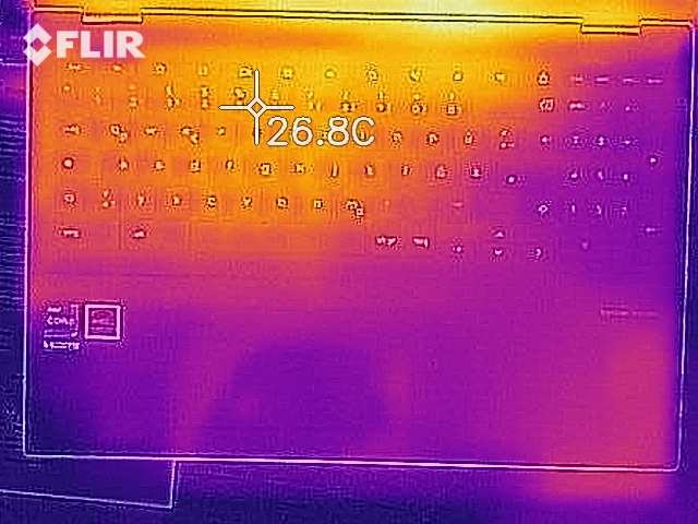 El Chromebook no se calienta demasiado. Bajo carga (pruebas de Octane V2 y Jetstream ejecutadas en bucle), se supera la marca de 40 °C en un punto de medición. En el uso diario (aplicaciones de oficina e Internet), los valores se mantienen claramente en el rango verde