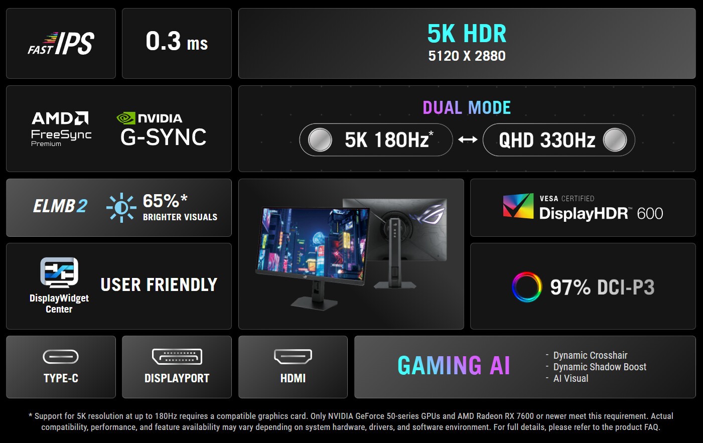 Incluso con su resolución nativa 5K, el XG27JCG puede alcanzar una suave frecuencia de refresco de 180 Hz. Huelga decir que los usuarios necesitarán una GPU bastante potente para alcanzar ese techo. Asus recomienda una tarjeta Nvidia GeForce serie RTX 50 o AMD Radeon RX 7600 y posteriores. Otras características para juegos incluyen la compatibilidad con G-Sync y FreeSync Premium, un tiempo de respuesta GtG de 0,3 ms y Extreme Low Motion Blur 2 (ELMB 2) para mejorar la claridad en los juegos de ritmo rápido.