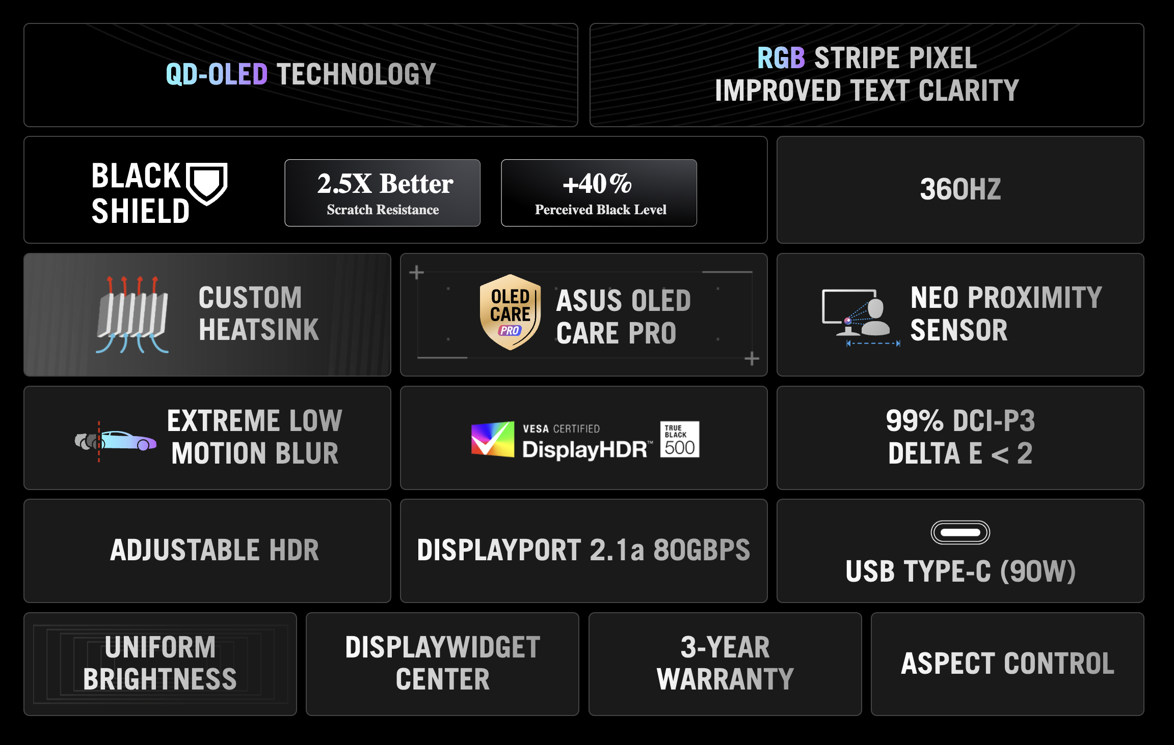 Por el contrario, el ROG Swift OLED PG34WCDN se une al HyperX Omen OLED de 34 pulgadas de HP como uno de los primeros monitores para juegos en utilizar la tecnología QD-OLED Gen 5 de Samsung Display. Por un lado, se dice que este nuevo panel ofrece una claridad de texto mejorada gracias a una matriz de subpíxeles RGB Stripe Pixel. En la práctica, este cambio debería reducir las franjas de color, que siguen siendo un defecto de los paneles QD-OLED y WOLED actuales. Por otra parte, el nuevo panel QD-OLED debería alcanzar los 500 nits en modo SDR y los 1.300 nits en áreas pequeñas al visualizar contenidos HDR.