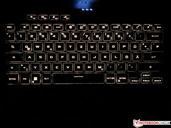 La unidad base sigue estando hecha de una aleación de magnesio, aunque las superficies tienen un ligero acabado suave al tacto. Sin embargo, esto no es una crítica, y el dispositivo parece un producto de calidad e incluso las huellas dactilares no son un gran problema. La unidad base está ligeramente elevada al abrir la tapa, lo que mejora la térmica y la ergonomía. La estabilidad es realmente buena, el teclado no se flexiona y no pudimos torcer la unidad base. También nos gusta el ajuste de las bisagras, aunque no pueden evitar un pequeño tambaleo cuando ajustas el ángulo de apertura (hasta 180 grados). Sin embargo, esto no debería ser un problema en la práctica.