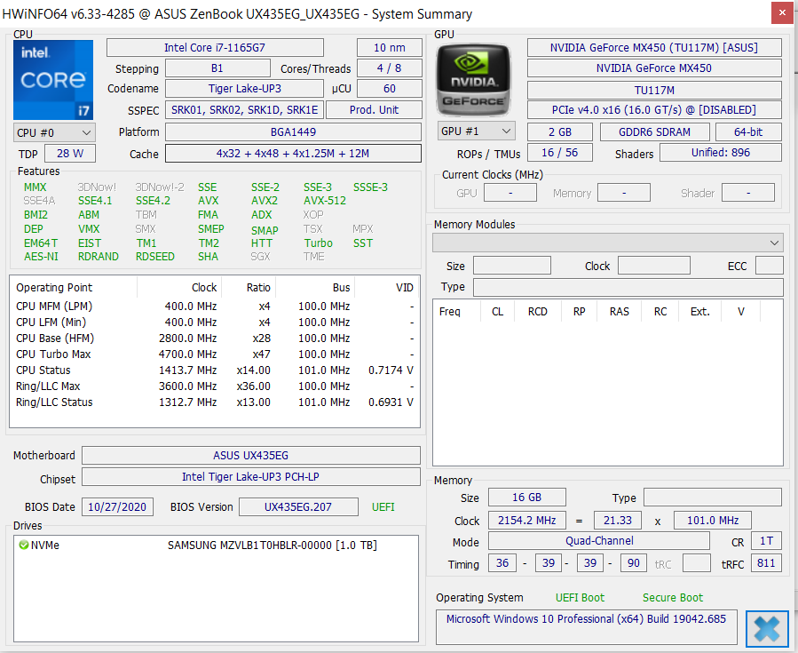 | Asus Zenbook 14 UX435EG i7-1165G7, GeForce MX450 | MSI Prestige 14 Evo A11M-005 i7-1185G7, Iris Xe G7 96EUs | Huawei MateBook 14 2020 Intel i7-10510U, GeForce MX350 | Lenovo Yoga Slim 7-14IIL05 i7-1065G7, GeForce MX350 | Medio NVIDIA GeForce MX450 | Media de la clase Multimedia | |