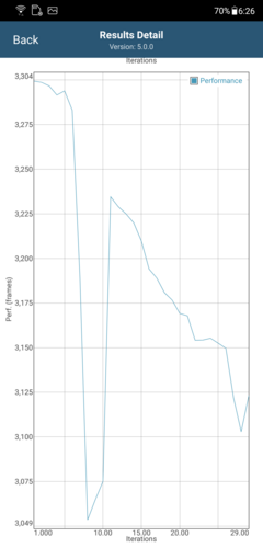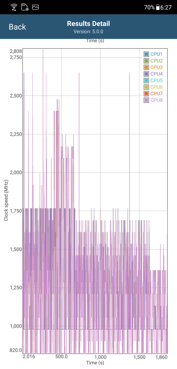 El T-Rex a largo plazo fue más indulgente. Todavía vemos que el rendimiento disminuye después de unas ocho iteraciones, pero no es tan drástico como antes. Se observaron picos debido al aumento de las temperaturas, pero los relojes de la CPU podían soportar 1.750 MHz durante un período de tiempo más largo, ya que las temperaturas máximas rondaban los 38 °C. Vemos un solo pico tocando 2,808 MHz pero ese punto alto nunca más fue alcanzado.