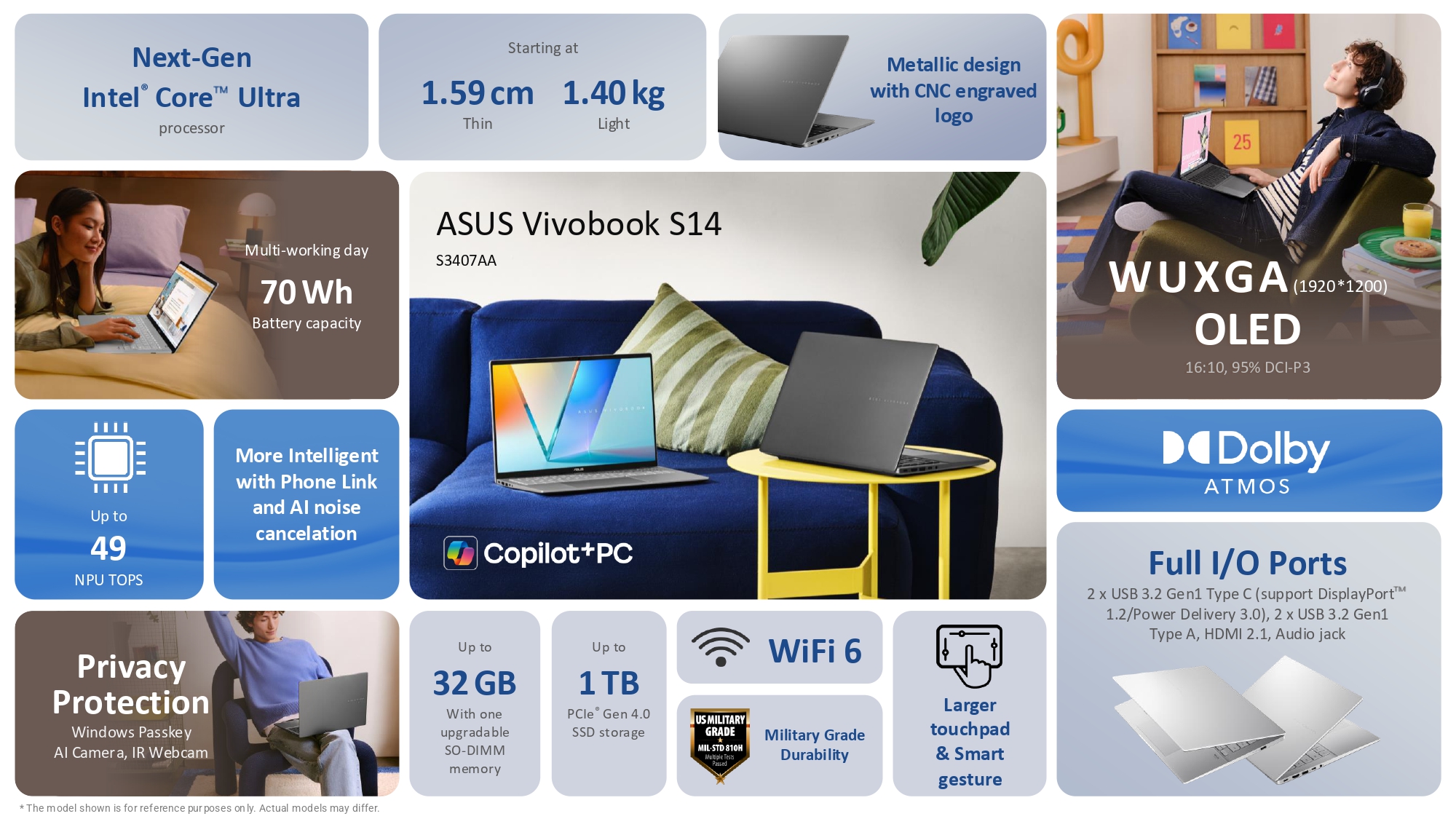 Ambos modelos presentan el mismo diseño metálico con el logotipo grabado con CNC. En cuanto a dimensiones, las tres variantes tienen un grosor de sólo 1,59 cm (0,62 pulgadas). Sin embargo, las variantes AMD y Snapdragon son ligeramente más pesadas, con un peso de 1,70 kg (3,74 libras). Mientras que la Vivobook S14/S16 variante Intel pesa sólo 1,40 kg (3 lbs).