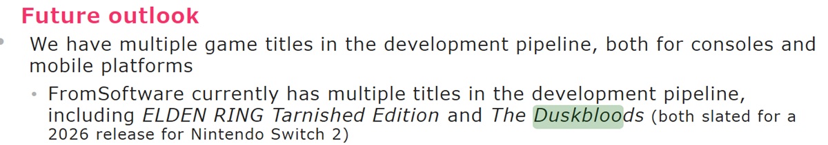 Kadokawa incluyó una actualización en su informe Q3 Fiscal Year 2026. Al hablar del descenso de los beneficios de explotación en comparación con el año anterior, hizo referencia a los Juegos Switch 2. The Duskbloods y Elden Ring Tarnished Edition están "ambos programados para su lanzamiento en 2026"