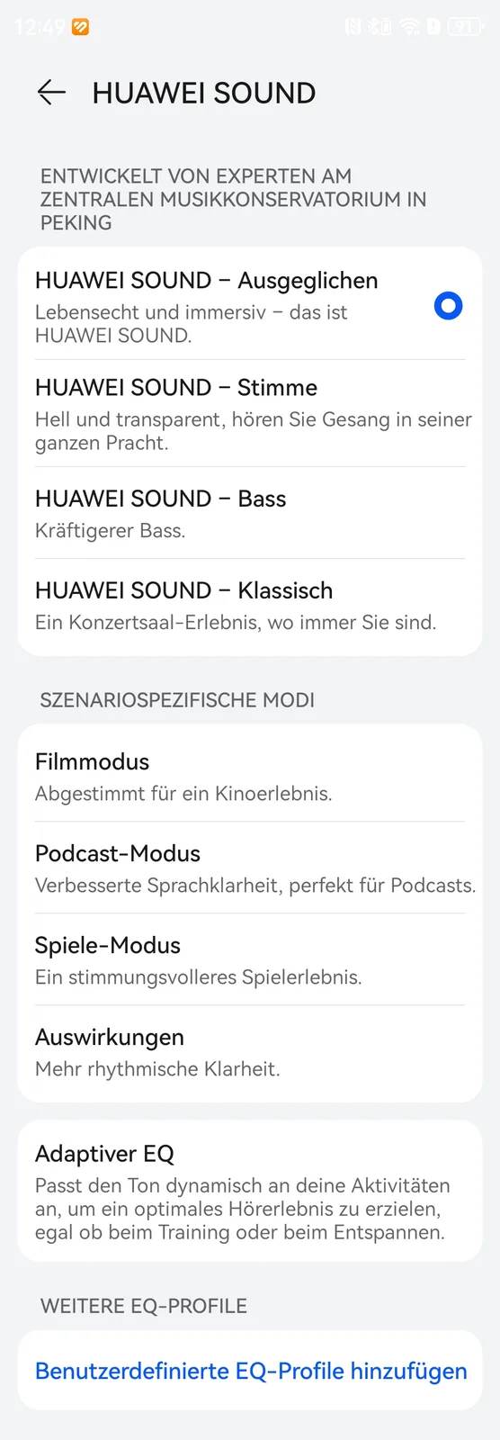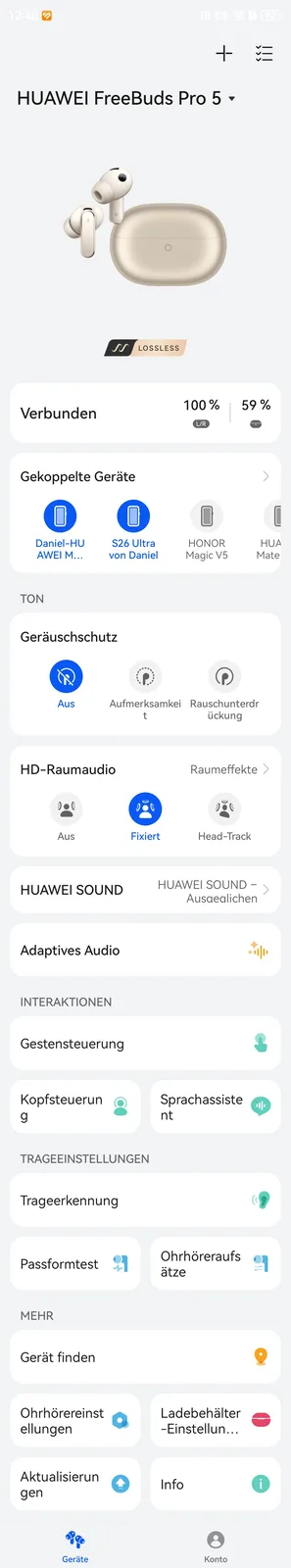 En la app, puede gestionar los dispositivos emparejados, instalar actualizaciones, configurar el ecualizador, configurar el audio espacial y mucho más. El códec AAC está disponible para los dispositivos Apple, mientras que los Android pueden utilizar LDAC. Los propietarios de smartphones o tabletas Huawei también tienen acceso a la transmisión sin pérdidas, que actualmente admite hasta 2,3 Mbps en los últimos modelos. Sin embargo, los propietarios de los modelos del año pasado deben conformarse de repente con L2HC 3.0 o 1,5 Mbps. Esto se aplica, entre otros, al Pura 70 Ultra y al Mate XTque antes podían utilizar los FreeBuds Pro 4 a 2,3 Mbps. Por qué Huawei está degradando artificialmente sus propios productos de esta manera sigue siendo un misterio para nosotros.