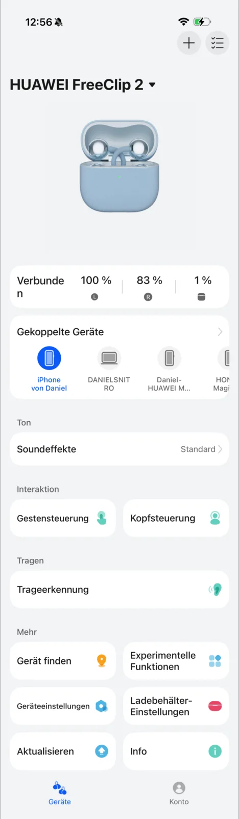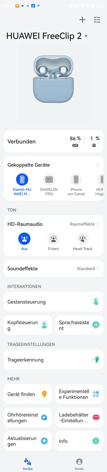 La configuración del Huawei FreeClip 2 es sencilla a través del emparejamiento Bluetooth. Gracias a Microsoft Swift Pair, esto sucede automáticamente en los ordenadores en cuanto se abre el estuche de carga por primera vez. Lo mismo ocurre en los smartphones y tabletas Huawei. Dado que Google Fast Pair no es compatible, el proceso de emparejamiento debe iniciarse manualmente. La compatibilidad multipunto permite emparejar dos dispositivos simultáneamente, y la lista de emparejamiento puede gestionar hasta ocho dispositivos.