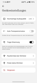 Sin embargo, también hay puntos débiles: la duración de la batería con ANC activo es sólo media (aprox. 5,5 horas), y cuando se utiliza LDAC + ANC, disminuye aún más. El propio ANC, especialmente en entornos ventosos o muy ruidosos, no siempre resulta del todo convincente. En conjunto, sin embargo, los Ear (3) ofrecen un paquete global coherente.