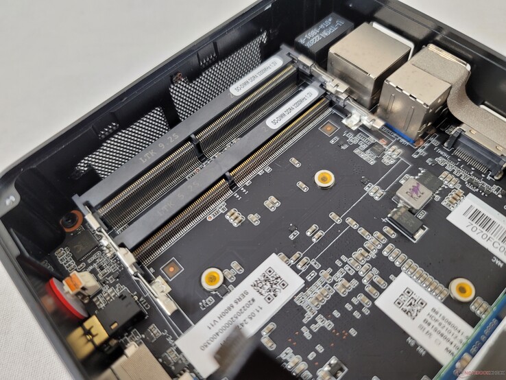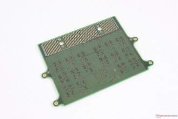 Los módulos SODIMM se fijan a la PCB mediante abrazaderas en ambos extremos, mientras que los módulos CAMM se fijan mediante seis tornillos Philips. Las clavijas del módulo CAMM hacen contacto con la interconexión gris entre la PCB y el CAMM, como se muestra en las imágenes siguientes.