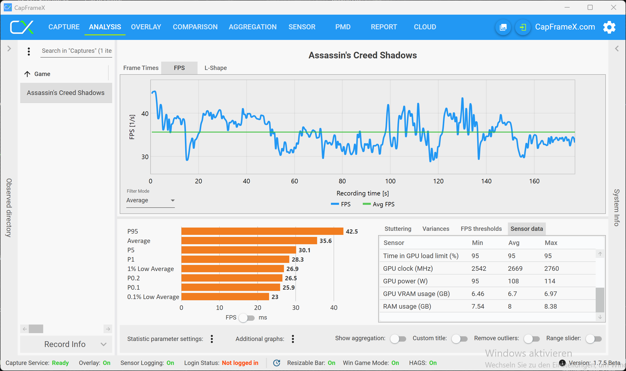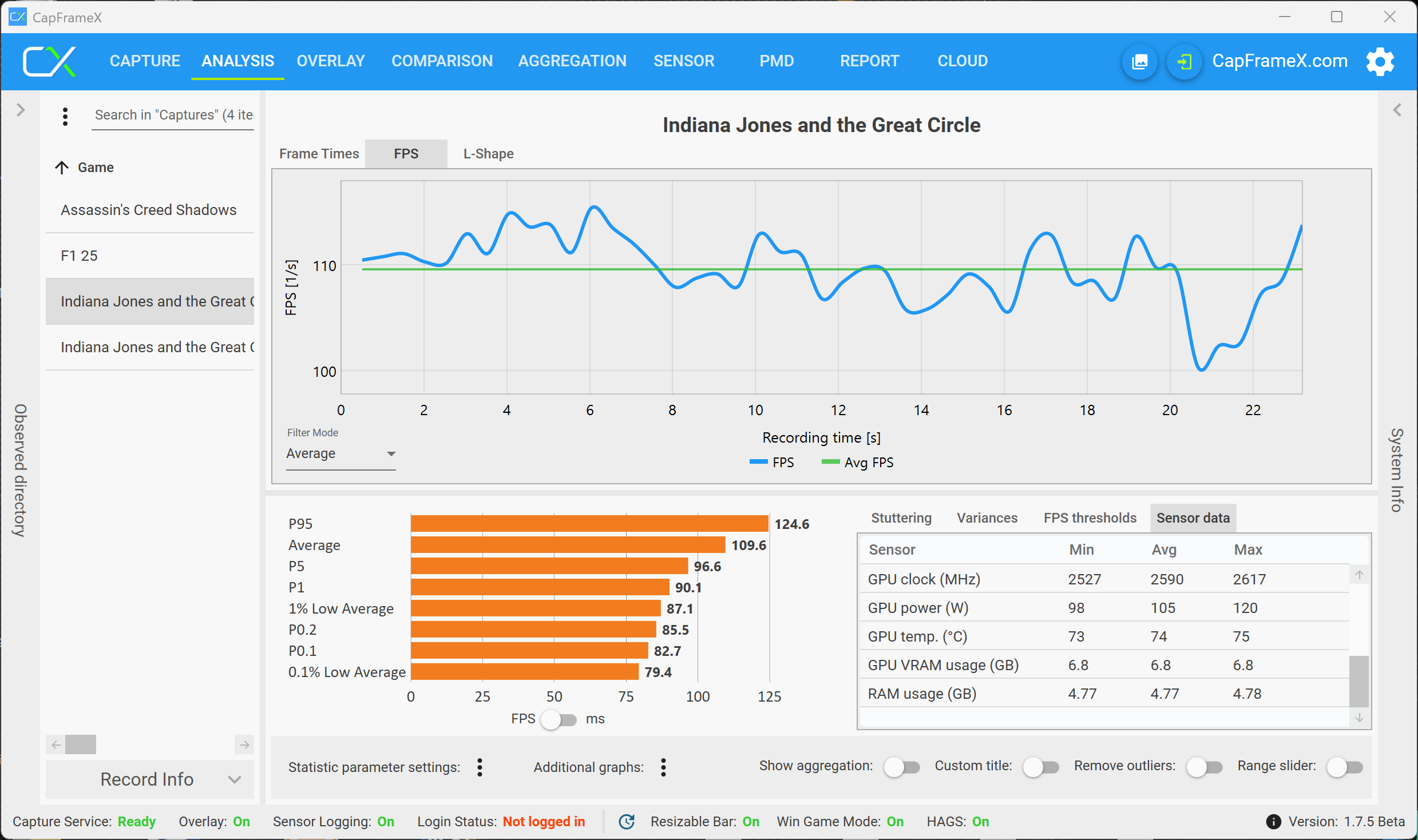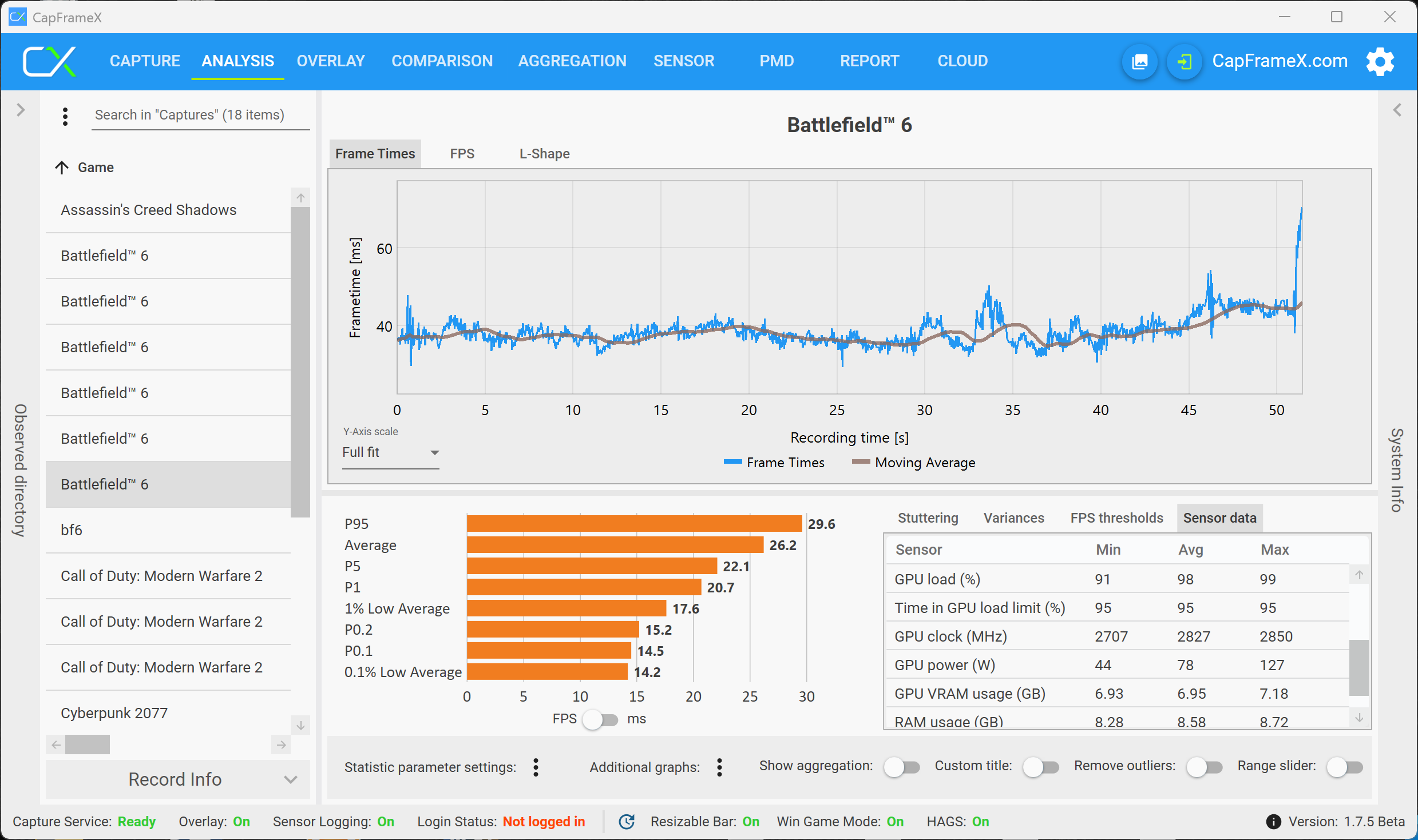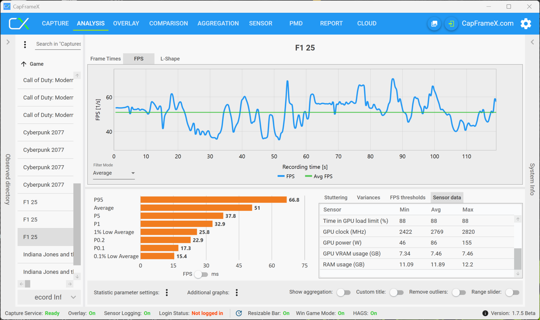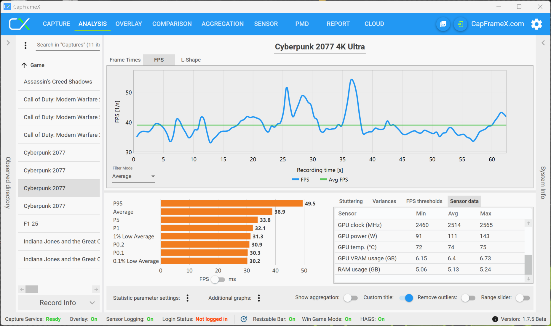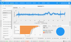 El hecho de que haya una advertencia de VRAM, sin embargo, no significa que necesariamente experimente problemas al jugar. Con la carga máxima para la RTX 5070 (la mayor carga de VRAM, pero aún así se puede jugar sin problemas), utilizamos la configuración 2560 x 1600 píxeles, Raytracing (Alto), DLSS y Generación de fotogramas (QHD RT no es jugable sin DLSS, pero al mismo tiempo 4K con RT no siempre está por encima de 30 fps, a pesar de DLSS y MFGx4) y jugamos al multijugador. Como ejemplo, el siguiente análisis muestra una partida multijugador, y muestra claramente que no hay limitaciones. La RTX 5070 Ti con 12 GB de VRAM no tiene ningún problema con la resolución 4K.