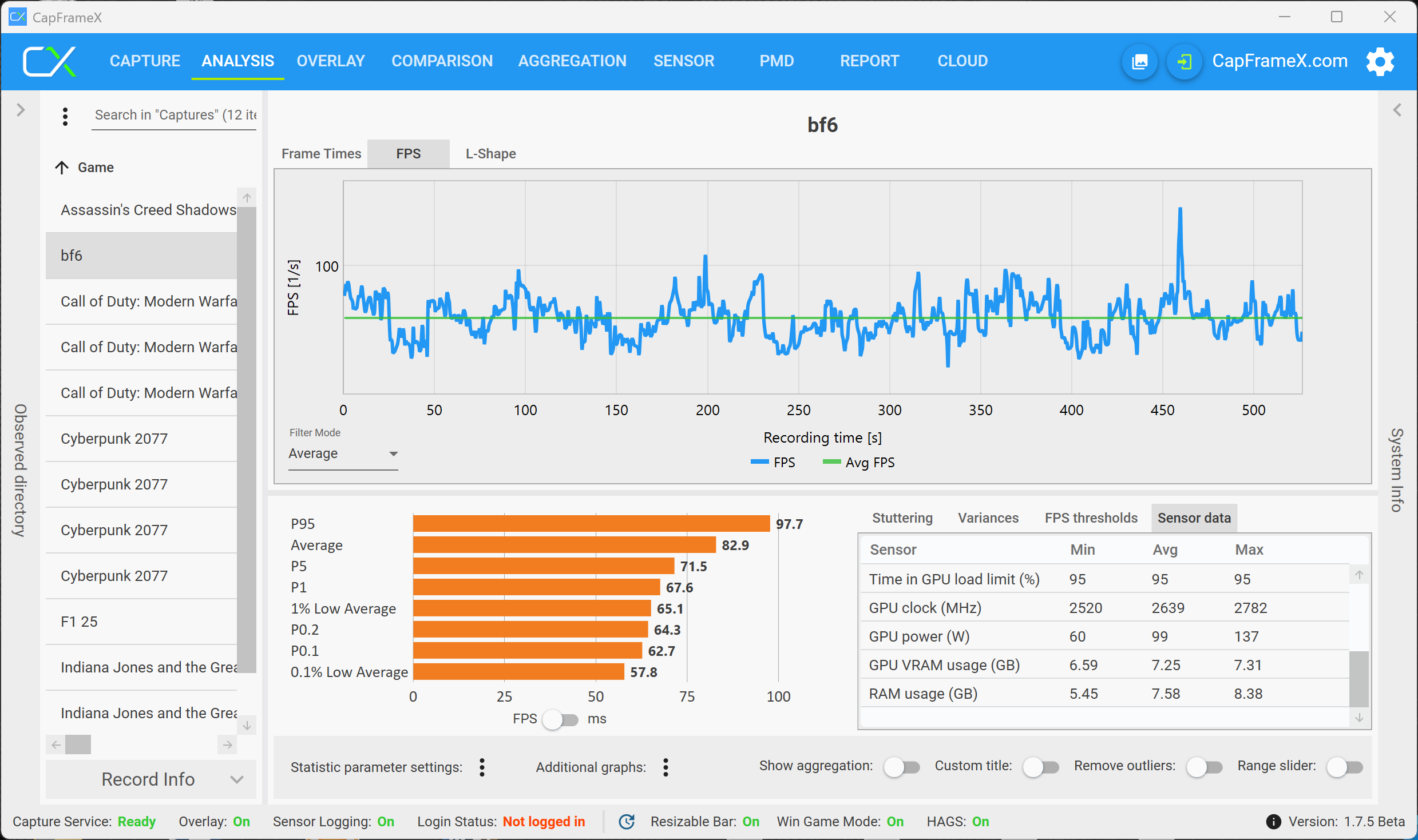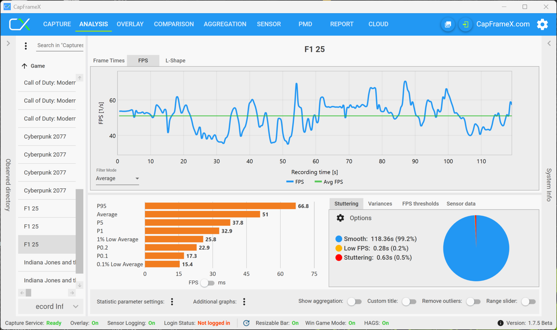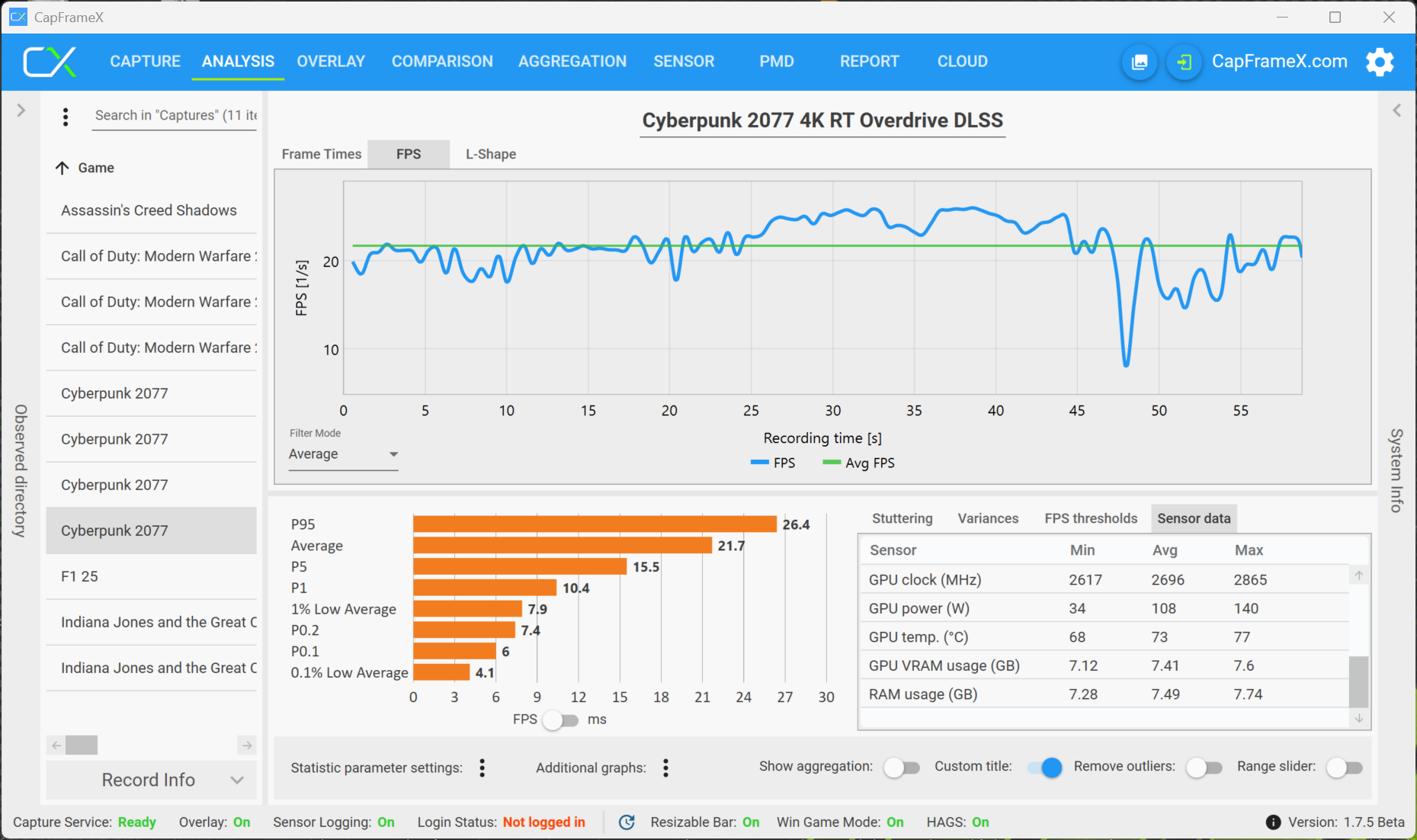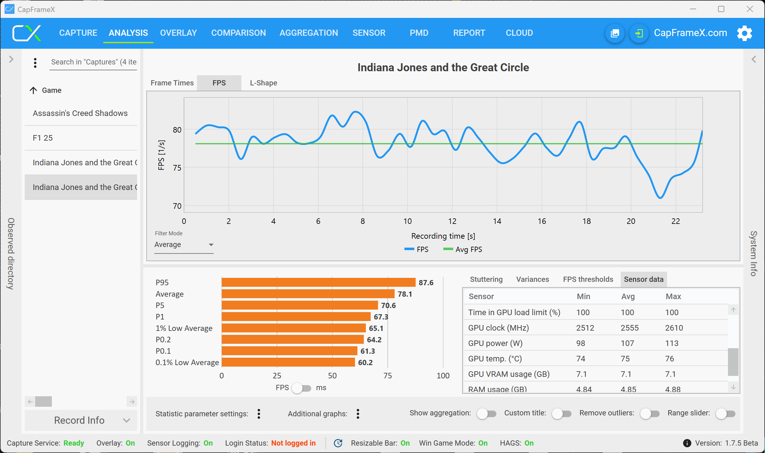 El hecho de que haya una advertencia de VRAM, sin embargo, no significa que necesariamente experimente problemas al jugar. Con la carga máxima para la RTX 5070 (la mayor carga de VRAM, pero aún así se puede jugar sin problemas), utilizamos la configuración 2560 x 1600 píxeles, Raytracing (Alto), DLSS y Generación de fotogramas (QHD RT no es jugable sin DLSS, pero al mismo tiempo 4K con RT no siempre está por encima de 30 fps, a pesar de DLSS y MFGx4) y jugamos al multijugador. Como ejemplo, el siguiente análisis muestra una partida multijugador, y muestra claramente que no hay limitaciones. La RTX 5070 Ti con 12 GB de VRAM no tiene ningún problema con la resolución 4K.