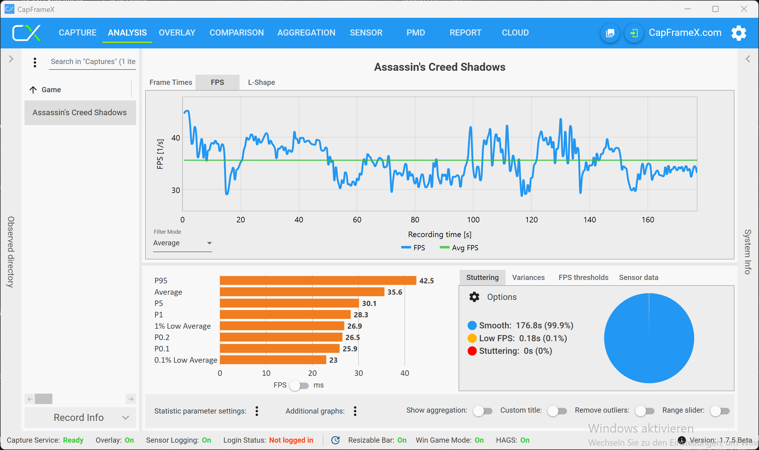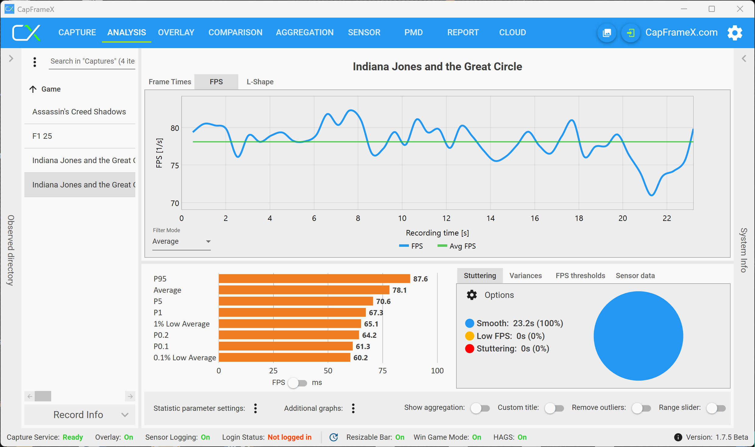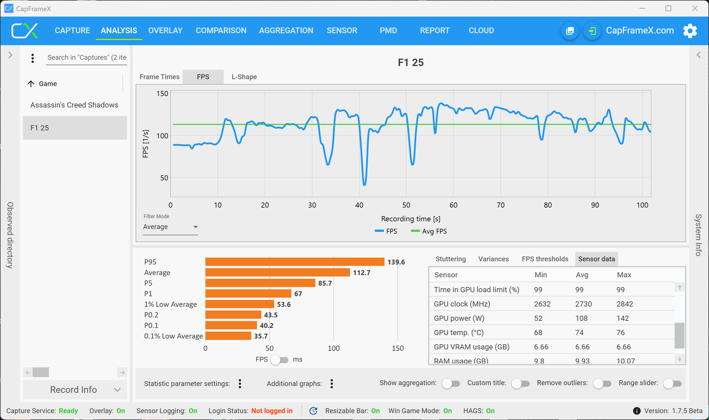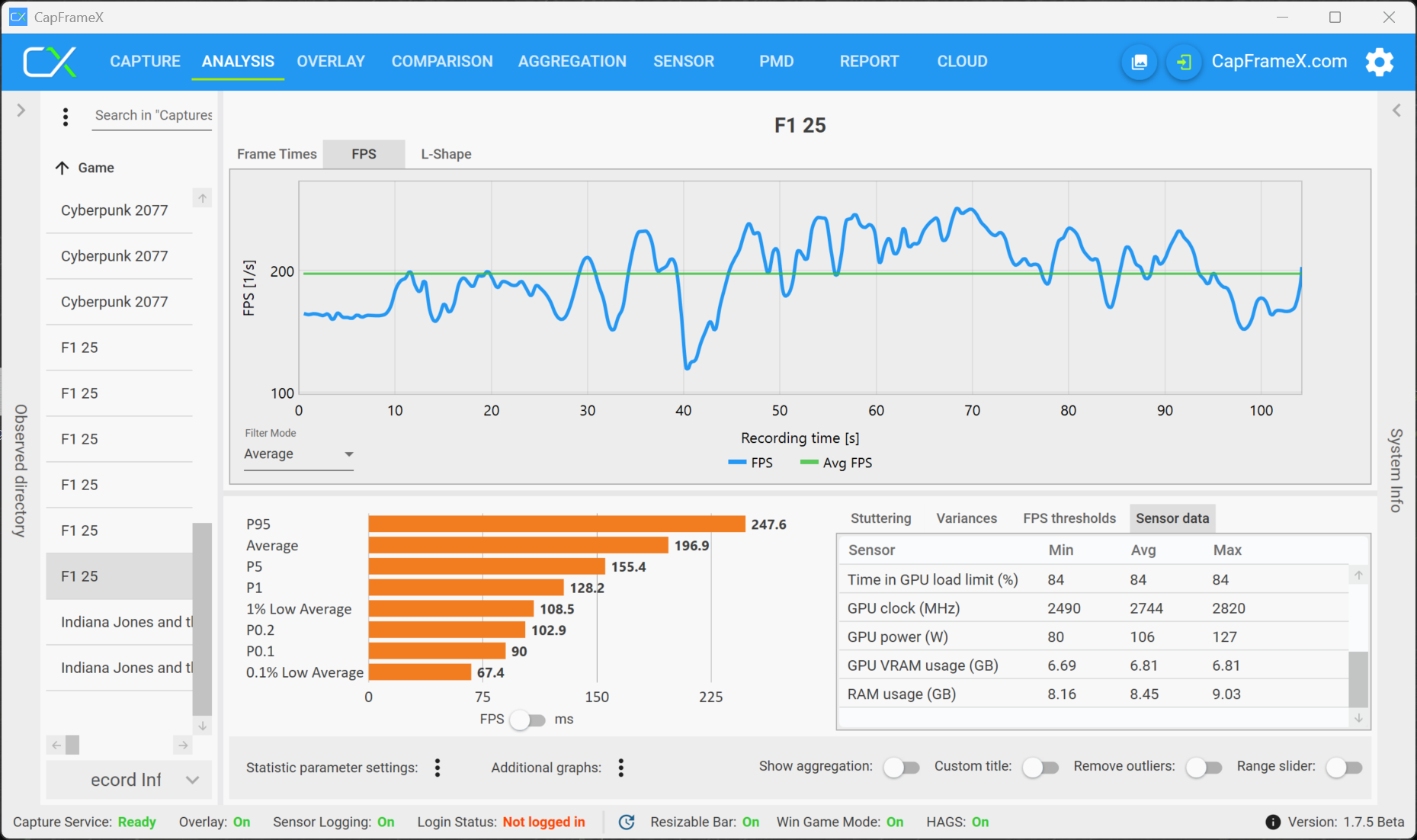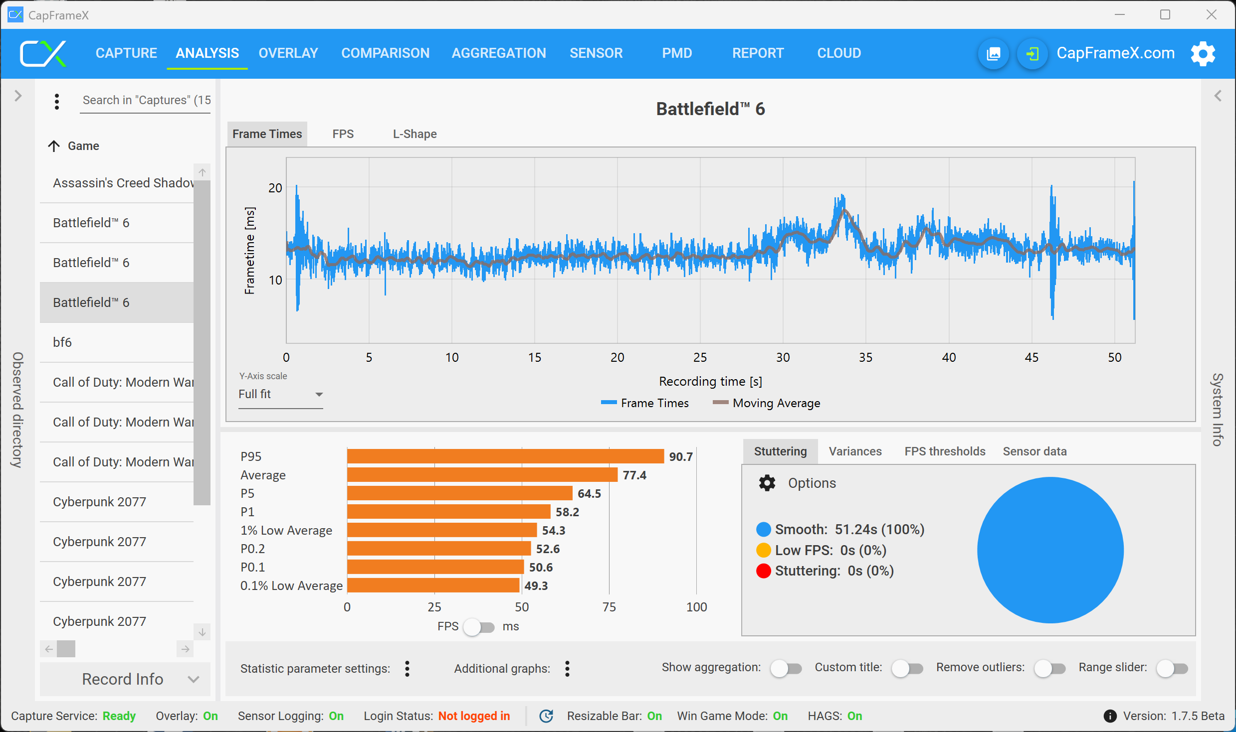 El hecho de que haya una advertencia de VRAM, sin embargo, no significa que necesariamente experimente problemas al jugar. Con la carga máxima para la RTX 5070 (la mayor carga de VRAM, pero aún así se puede jugar sin problemas), utilizamos la configuración 2560 x 1600 píxeles, Raytracing (Alto), DLSS y Generación de fotogramas (QHD RT no es jugable sin DLSS, pero al mismo tiempo 4K con RT no siempre está por encima de 30 fps, a pesar de DLSS y MFGx4) y jugamos al multijugador. Como ejemplo, el siguiente análisis muestra una partida multijugador, y muestra claramente que no hay limitaciones. La RTX 5070 Ti con 12 GB de VRAM no tiene ningún problema con la resolución 4K.