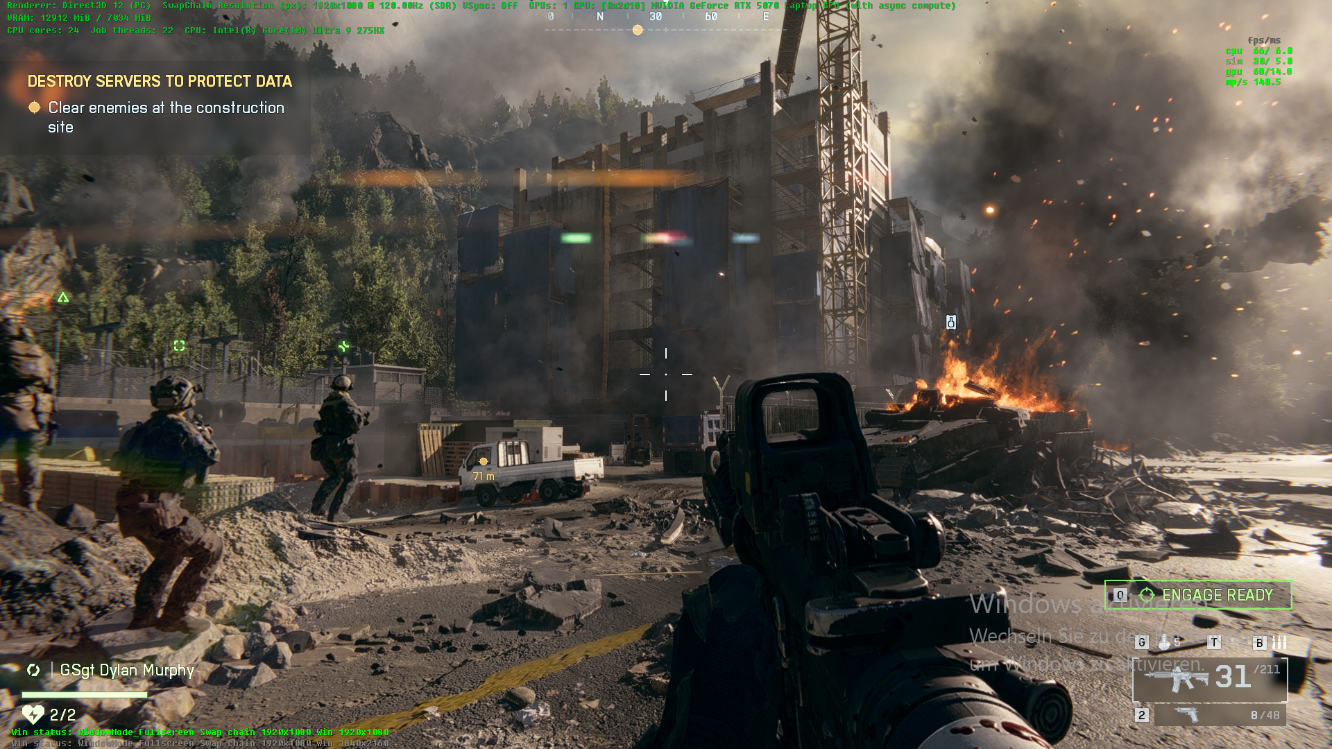Sin embargo, una vez que se empieza a jugar, la carga de VRAM aumenta constantemente. Jugamos la primera misión de la campaña y notamos que la carga de VRAM salta a 12,9 GB según la herramienta de monitorización integrada. Curiosamente, seguimos sin notar ningún problema de rendimiento en la resolución 1080p, ni durante la campaña ni en una partida multijugador.