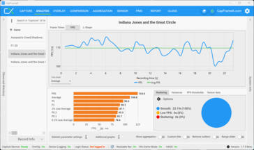 Indiana Jones y el Gran Círculo es actualmente el título más exigente en cuanto a requisitos de VRAM. En el menú de ajustes se puede activar la supervisión exhaustiva del rendimiento y también muestra la carga de VRAM. La RTX 5070con 8 GB de VRAM alcanza rápidamente su límite, porque ya puede haber cuelgues en 1080p cuando se selecciona el preajuste Alto . El juego funcionará sin problemas en 1080p y el preajuste Medio con una carga de VRAM ligeramente inferior a 7 GB.