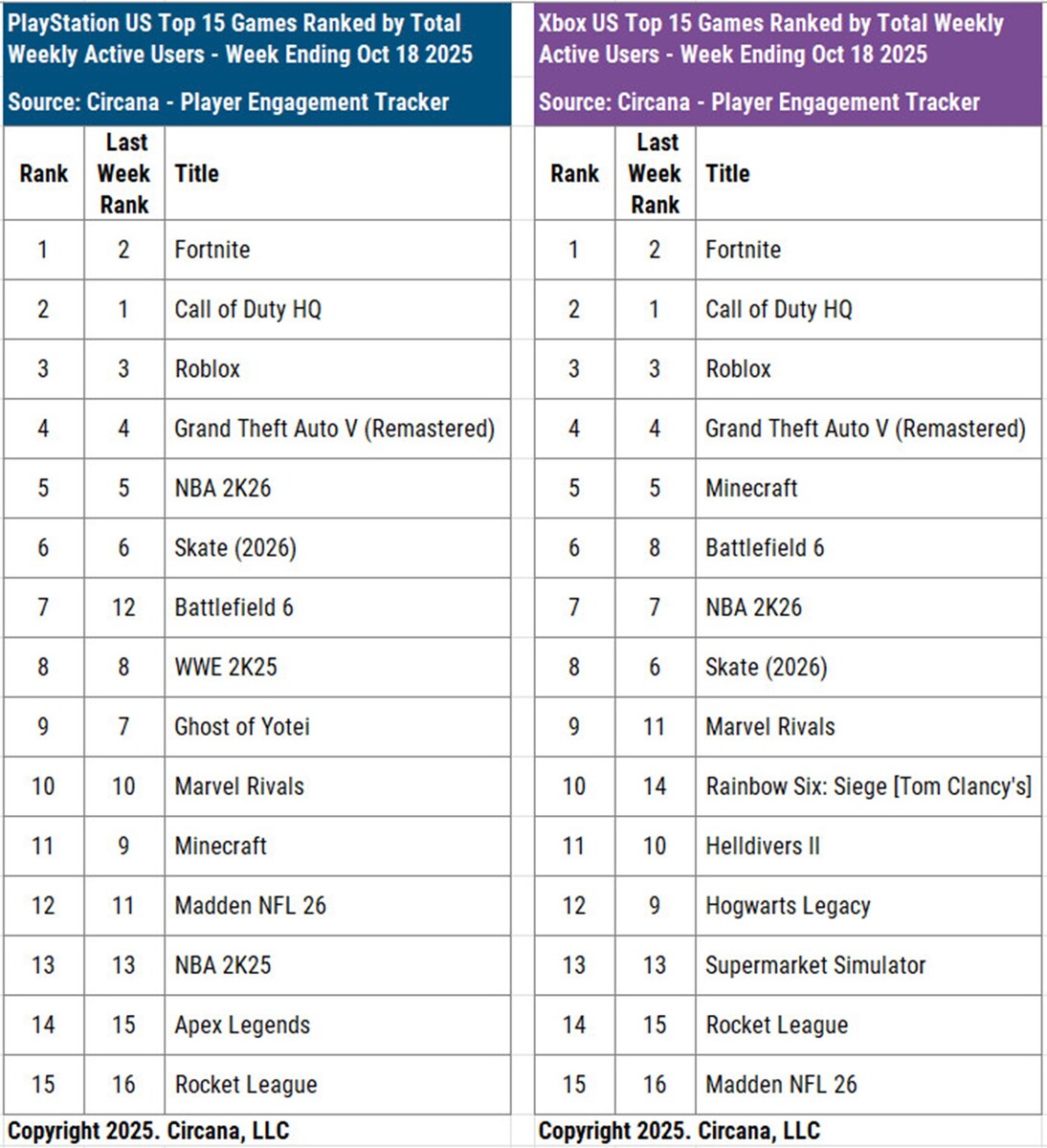 Mat Piscatella compartió los datos de Circana en Blueskyque muestran el compromiso de los jugadores en PlayStation y Xbox. Las estadísticas cubren la semana que finalizó el 18 de octubre, incluidos los primeros días tras la fecha de lanzamiento de Battlefield 6. Midiendo el total de usuarios activos en EE Cuartel General de Call of Duty ocupa el segundo lugar por detrás de Fortnite. Mientras tanto, el nuevo shooter de Dice ocupa el séptimo lugar en PlayStation y el sexto en las consolas Xbox.
