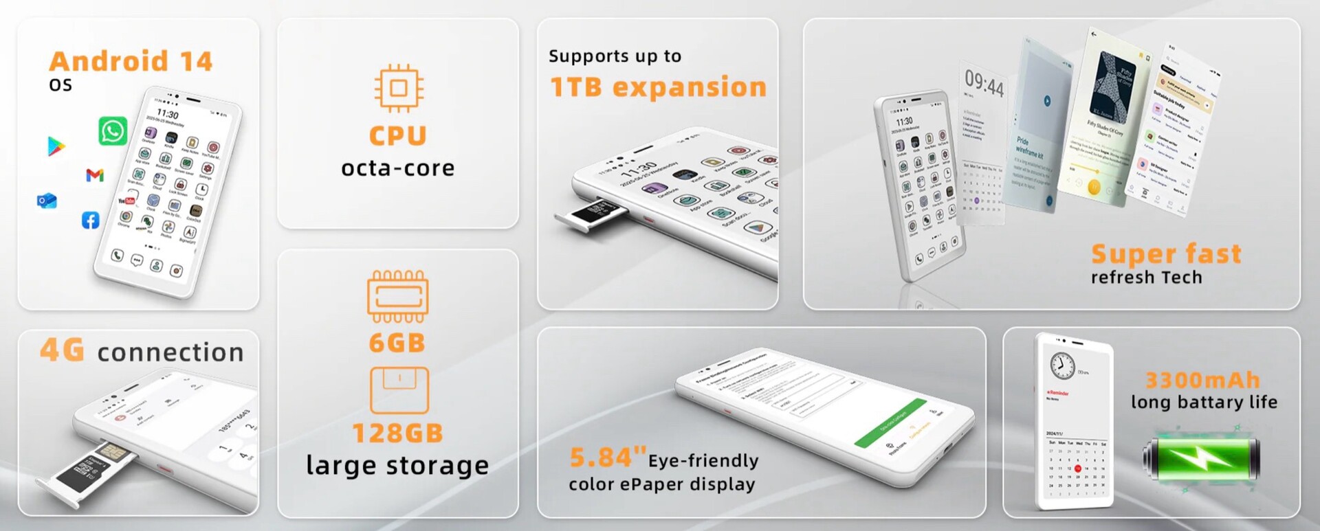 Con una cámara frontal de 5MP, una cámara principal de 13MP, un módem LTE integrado y un altavoz sobre la pantalla, el Bigme Hibreak S podría ser un sustituto de smartphone en toda regla, aunque su rendimiento probablemente esté por debajo de la media para los estándares actuales. No obstante, la batería tiene una capacidad de 3.300 mAh, lo que, combinado con la pantalla de bajo consumo, debería resultar en una larga autonomía a pesar del factor de forma más pequeño. Mientras tanto, el sistema operativo Android 14 ofrece acceso a innumerables aplicaciones de terceros, pero Bigme no ha confirmado si el teléfono recibirá futuras actualizaciones de Android.