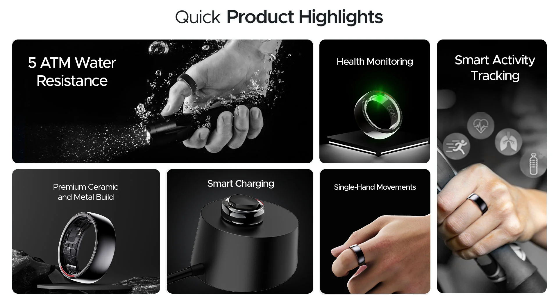 Como se desveló a principios de mes en, el anillo inteligente boAt puede monitorizar la frecuencia cardiaca, el sueño, la temperatura corporal, el nivel de SpO2 y la recuperación corporal. Ofrece un seguimiento de la actividad para deportes como correr, caminar y montar en bicicleta, con información sobre la salud y el ejercicio en una aplicación complementaria. Otras características incluyen una herramienta de alerta SOS de emergencia y resistencia al agua hasta 5 ATM.