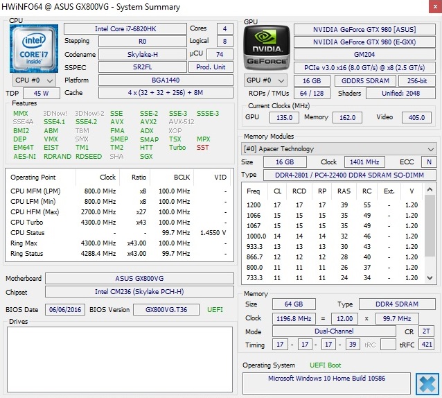 | Asus GX800 Prototype 3x Samsung SM951 512 GB NVMe M.2 (RAID 0) | MSI GT80S 6QF 2x Samsung SM951 MZVPV256HDGL (RAID 0) | Asus GX700 2x Samsung SM951 MZVPV512HDGL (RAID 0) | Schenker XMG U726 Samsung SM951 MZHPV512HDGL m.2 PCI-e | |