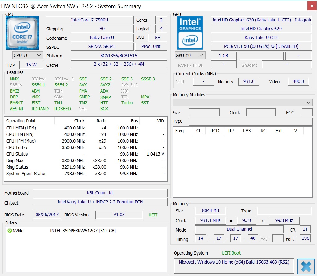 | Acer Switch 5 SW512-52-5819 HD Graphics 620, i7-7500U, Intel SSD 600p SSDPEKKW512G7 | Microsoft Surface Pro (2017) i5 HD Graphics 620, i5-7300U, Samsung PM971 KUS030202M | HP Elite x2 1012 G1 HD Graphics 515, 6Y54, Liteon L8H-256V2G | Dell Latitude 12 5285 2-in-1 HD Graphics 620, i7-7600U, Samsung PM961 MZVLW256HEHP | Lenovo Ideapad Miix 720-12IKB HD Graphics 620, i7-7500U, Samsung SSD PM961 1TB M.2 PCIe 3.0 x4 NVMe (MZVLW1T0) | Acer Aspire Switch Alpha 12 SA5-271-56HM HD Graphics 520, 6200U, Kingston RBU-SNS8152S3256GG2 | |