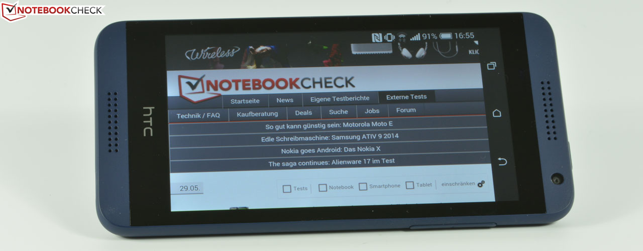 Con el Desire 610 HTC se interna en el sector de los mini-smartphones. El teléfono está equipado con una pantalla TFT de 4.7 pulgadas suficientemente brillante y con iluminación equilibrada con unos buenos ángulos de visualización. La pantalla táctil es una delicia ya que es muy precisa y funciona bien incluso en las esquinas. También nos ha gustado la calidad de fabricación, a pesar de que la parte posterior brillante y un poco resbaladizo no encaja demasiado. Otros aspectos positivos son el rápido SoC de cuatro núcleos que permite un buen rendimiento en general y también con juegos. El smartphone ejecuta la versión actual de Android (4.4 KitKat). La unidad flash interna es también muy rápida, a pesar de que 4 GB de espacio usable pueden ser un poco escasos - pero al menos se puede ampliar usando una tarjeta microSD. Además, LTE/4G permite descargas rápidas. La calidad de recepción así como la potencia de la señal GPS es muy buena. Los altavoces estereo en el frontal y la calidad de voz decente contribuyen a nuestra impresión general positiva.