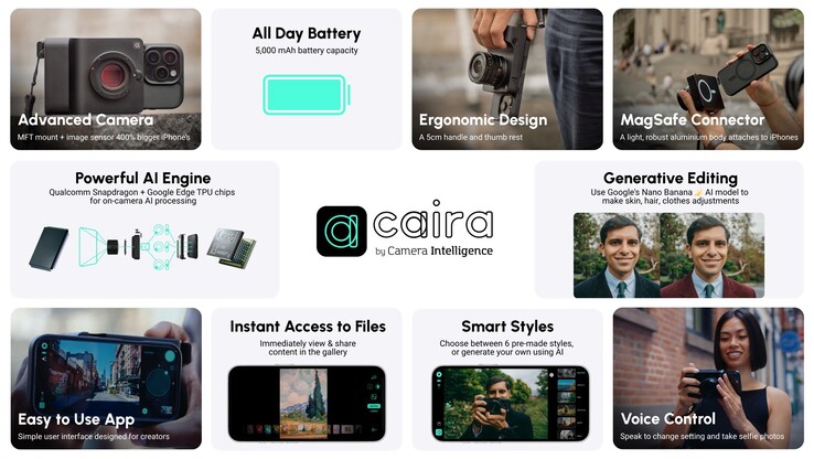 Caira no se centra en las funciones tradicionales de la cámara, sino en las funciones generativas de la IA. Gracias a un procesador Qualcomm Snapdragon integrado y al acelerador de IA Google Edge, Caira puede acceder directamente al modelo de IA "Nano Banana" de Google y modificar las fotos al instante. Por ejemplo, es posible alterar un paisaje diurno para que parezca que la foto se tomó de noche.
