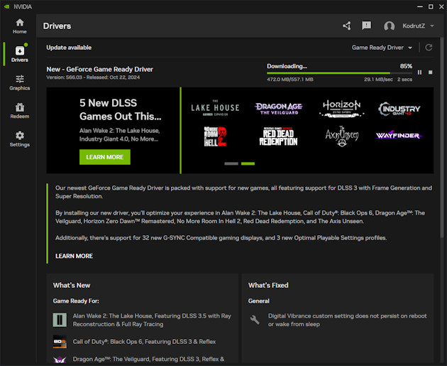 Ayer, Nvidia publicó una nueva actualización de controladores para su línea de productos GeForce y, a diferencia de algunas de sus predecesoras, la versión 566.03 va en serio. En el pasado, no era de extrañar que los nuevos paquetes de software de controladores Game Ready de GeForce vinieran sólo con optimizaciones para dos o tres juegos y, tal vez, para añadir unas cuantas pantallas compatibles con G-Sync y ajustes preestablecidos a los ya existentes. Ahora, estamos hablando de nada menos que siete juegos, 32 pantallas y tres perfiles de juego.