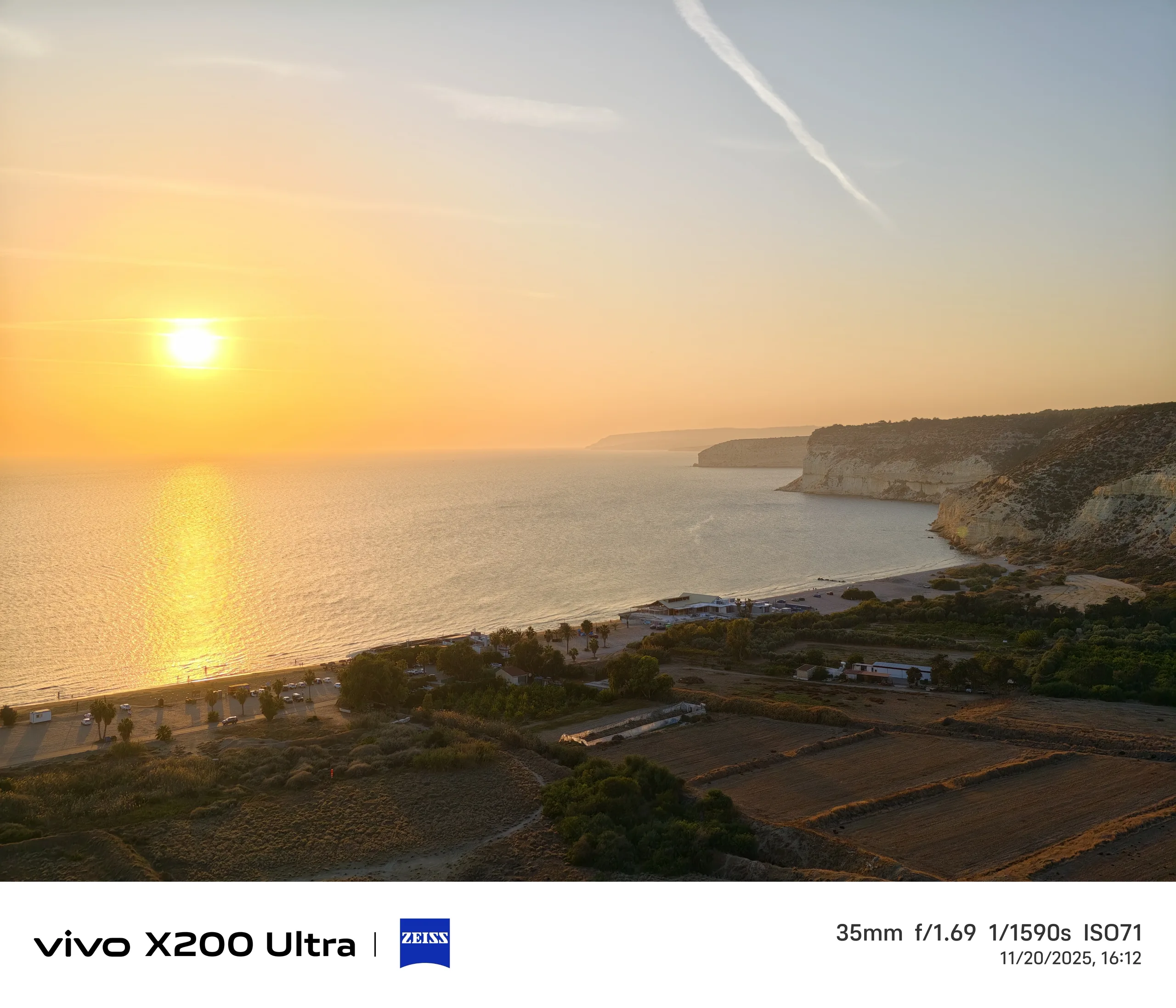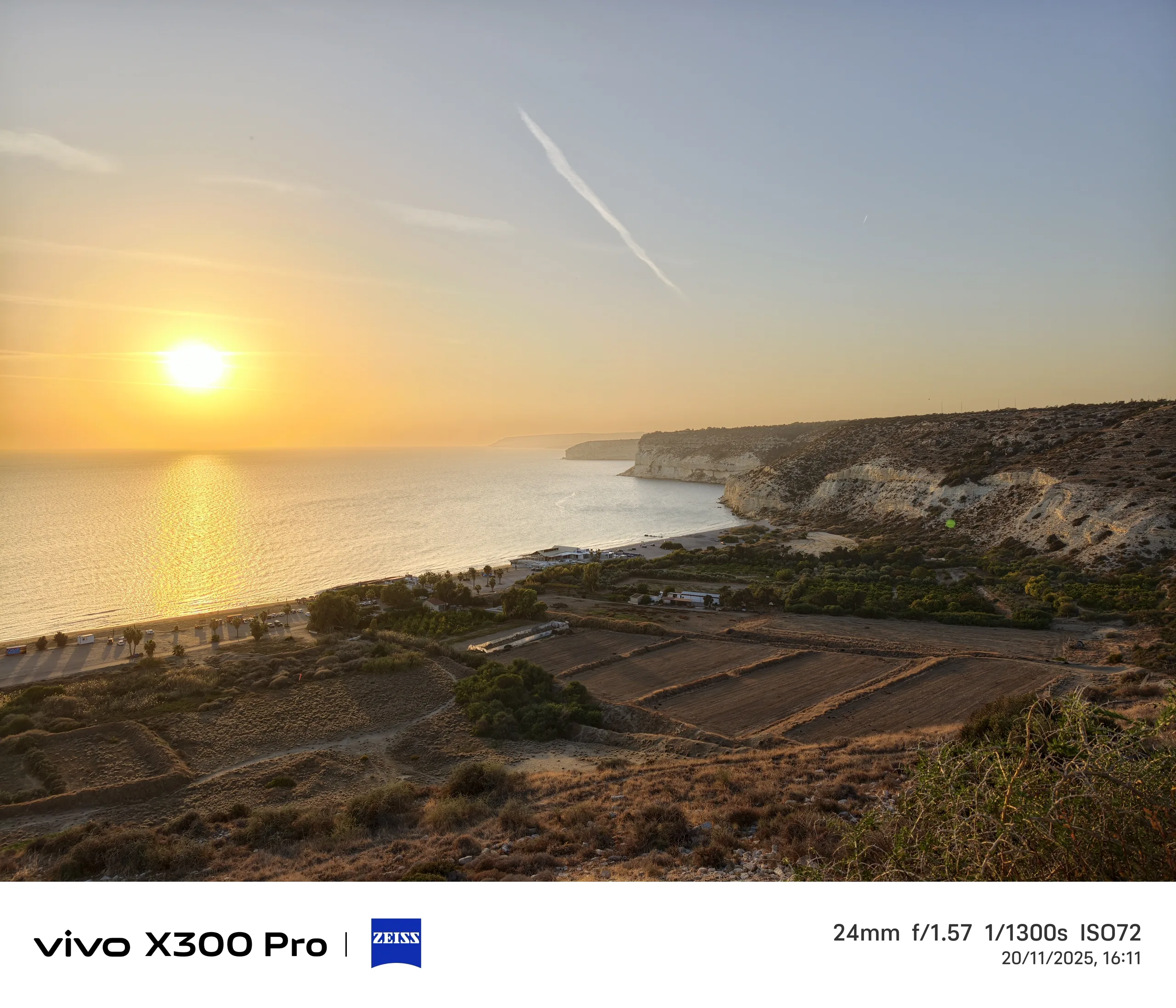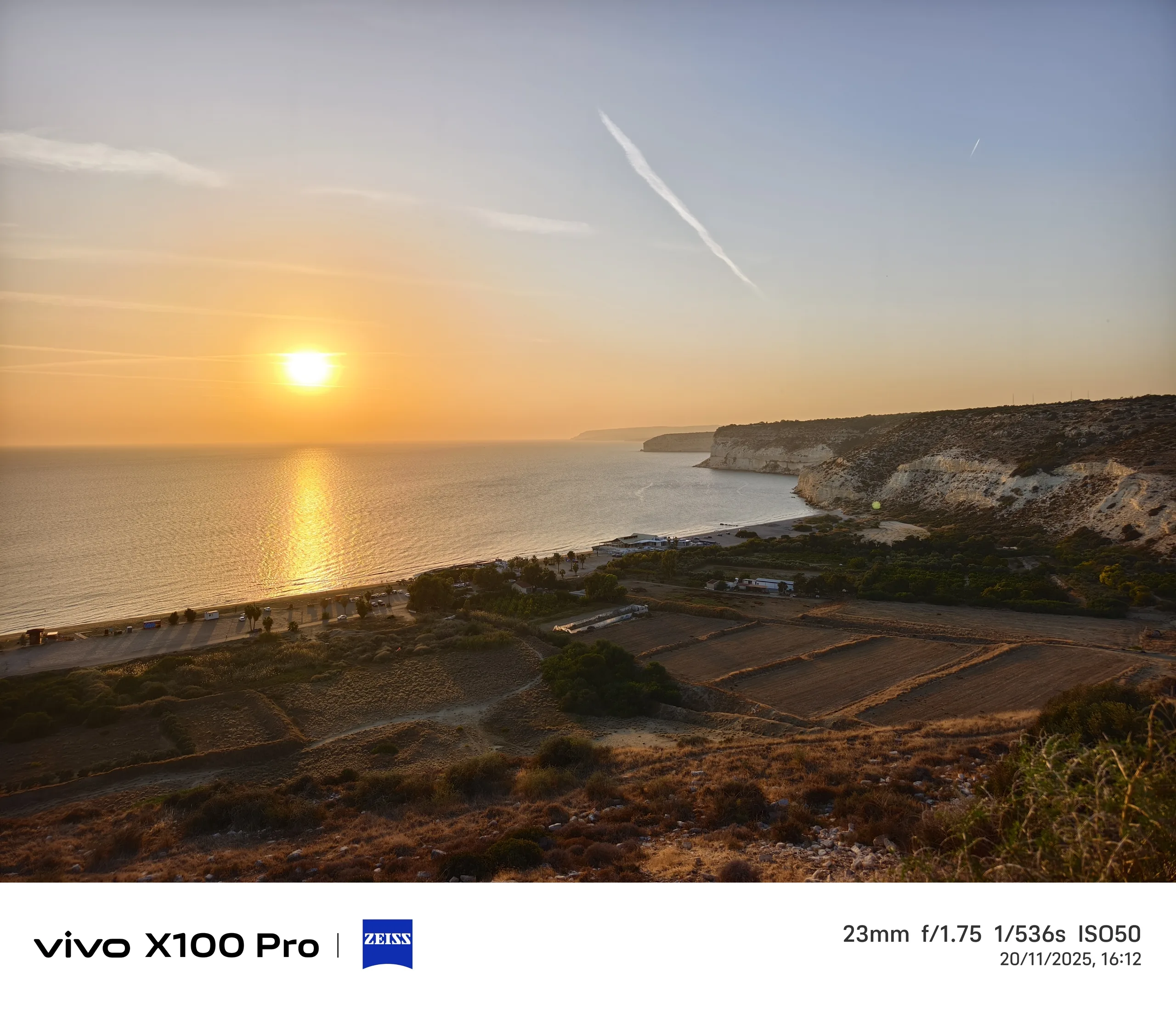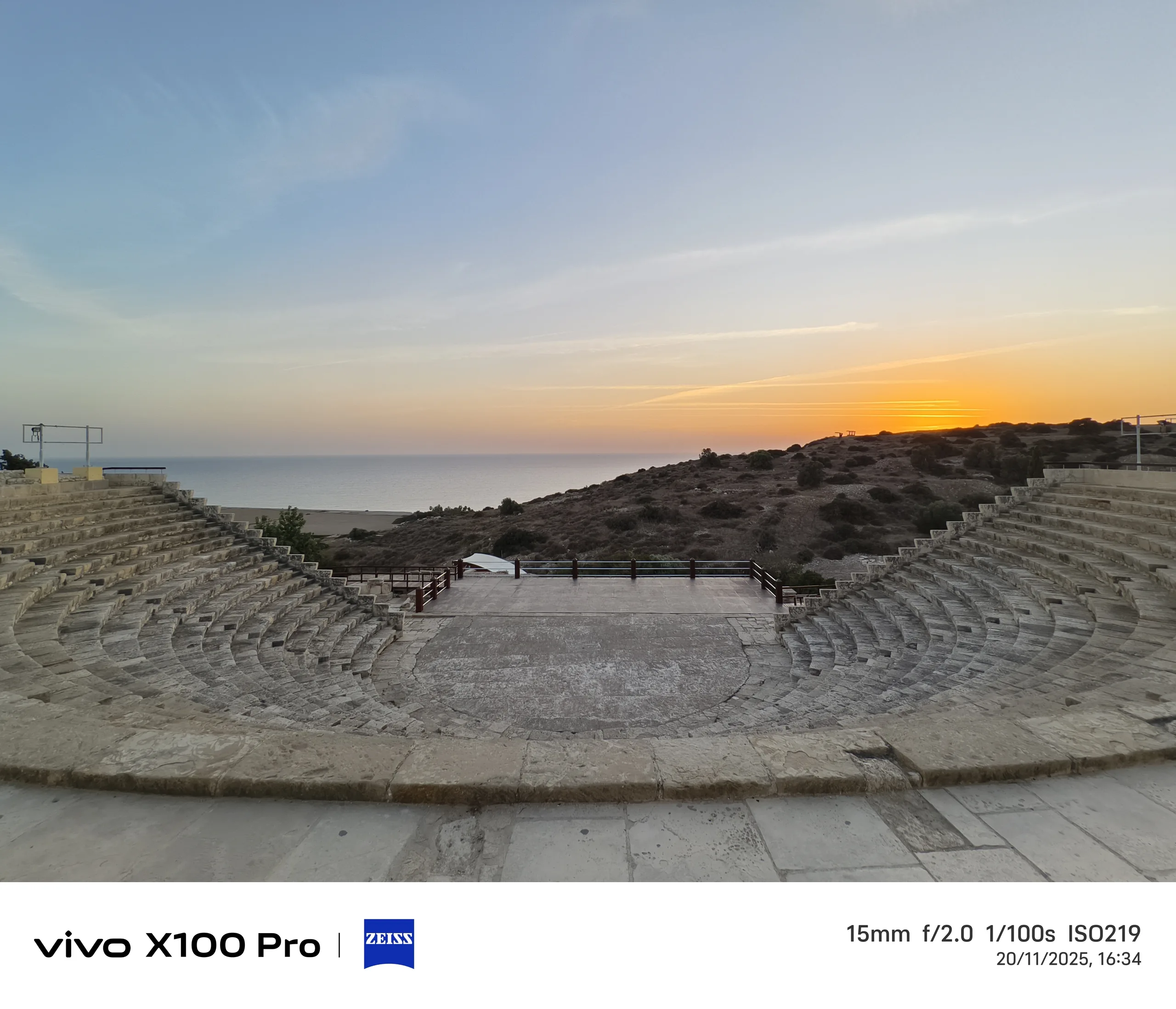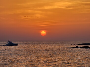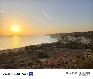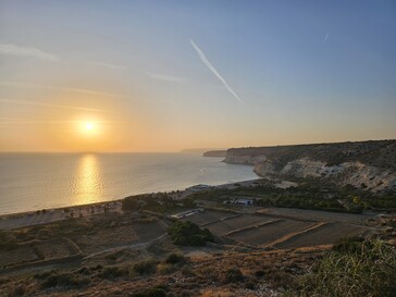 Para el segundo ejemplo, volvemos a Kourion, mirando hacia la puesta de sol y la playa de Kourion. El sensor de 1 pulgada de la Vivo X100 Pro ofrece la interpretación más colorida de la puesta de sol, pero no necesariamente la más precisa, ya que el sol no estaba tan rojo en ese momento. A pesar de tener el sensor más grande y la velocidad de obturación más larga, esta foto es también la más oscura.
