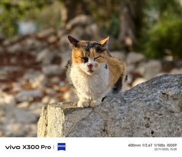 Con el teleconvertidor del Vivo X300 Pro, el teleobjetivo 3,7x puede convertirse en un objetivo 8,7x. Esta solución es más engorrosa, pero produce un efecto similar. A continuación se muestran algunas tomas realizadas con zoom óptico 8,7x y 10x; el segundo retrato de gato se capturó con 17,4x y 20x, respectivamente.