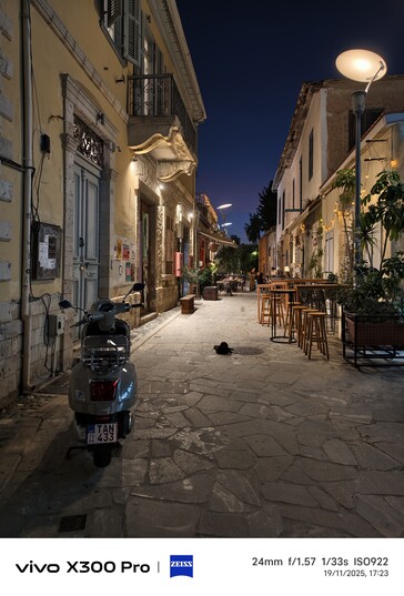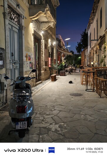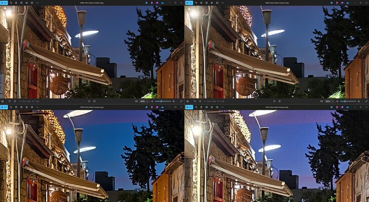 A primera vista, destacan las luces sobreexpuestas de la Galaxy S23 Ultra, mientras que los tres modelos Vivo mantienen las luces mucho mejor bajo control. La Vivo X200 Ultra es la que muestra más detalle en los objetos lejanos, lo que no es de extrañar dada su distancia focal de 35 mm. En retrospectiva, este resultado apoya el alejamiento de Vivo del IMX989: a pesar de los sensores más pequeños, la Vivo X100 Pro no puede seguirle el ritmo, ni siquiera a corta distancia. Por ejemplo, a la izquierda de la motocicleta, la Vivo X300 Pro muestra más detalle que tanto la X100 Pro como la X200 Ultra.