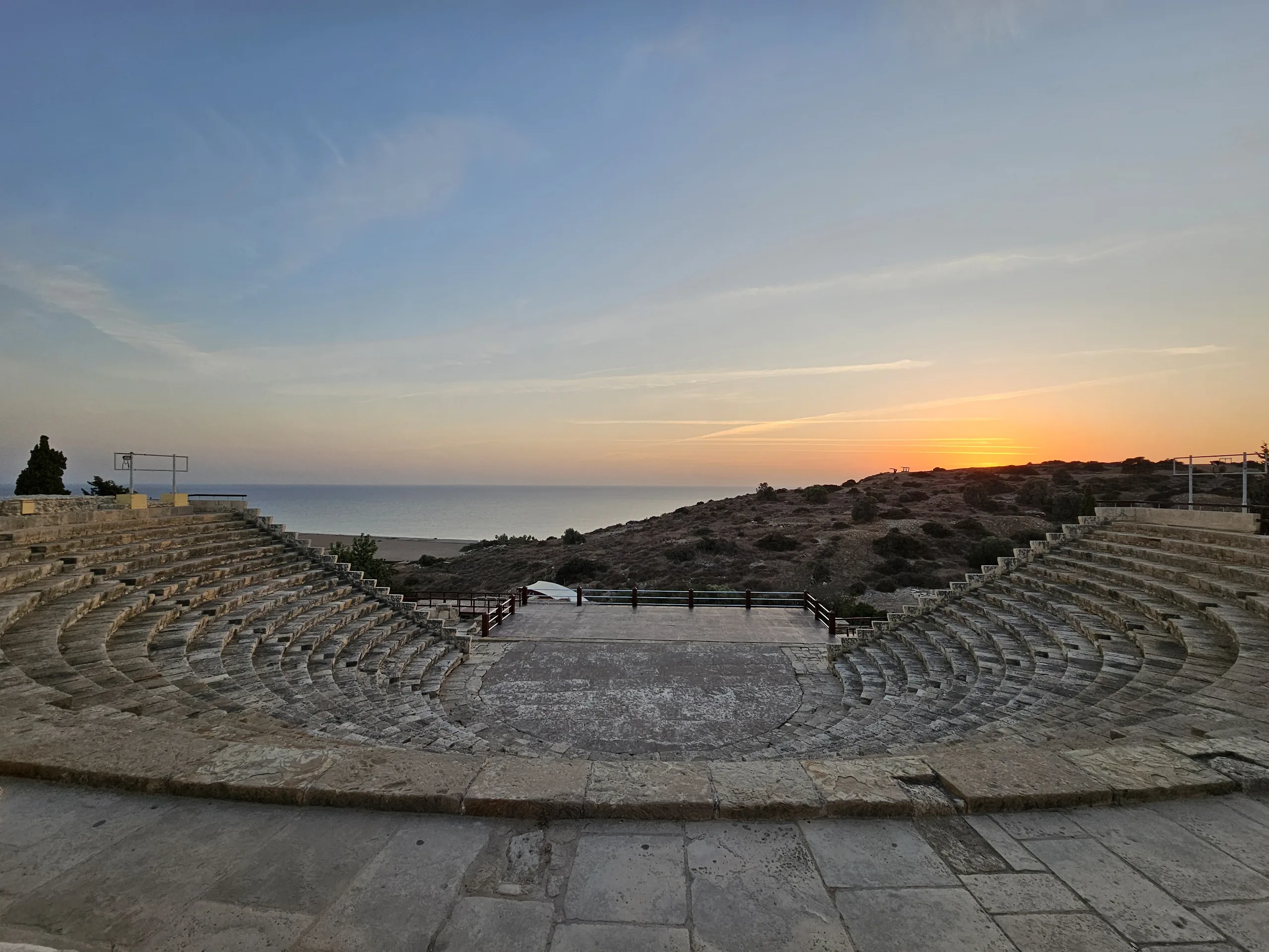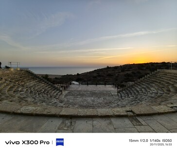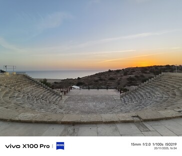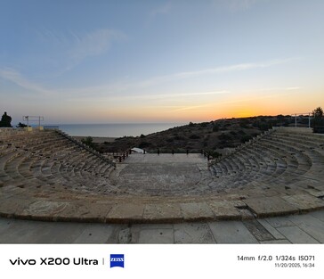 Para el segundo ejemplo de ultra gran angular, nos trasladamos a 81 kilómetros, a Curium (Kourion), un antiguo yacimiento arqueológico con una gran vista de los alrededores. En noviembre, no suele haber mucho que hacer aquí, por lo que algunas partes del yacimiento pueden parecer casi desiertas, como el anfiteatro al atardecer. Esta comparación también incluye el teléfono Samsung de 2023 en la línea de ultra gran angular, que se muestra en la esquina inferior derecha en cada imagen.
