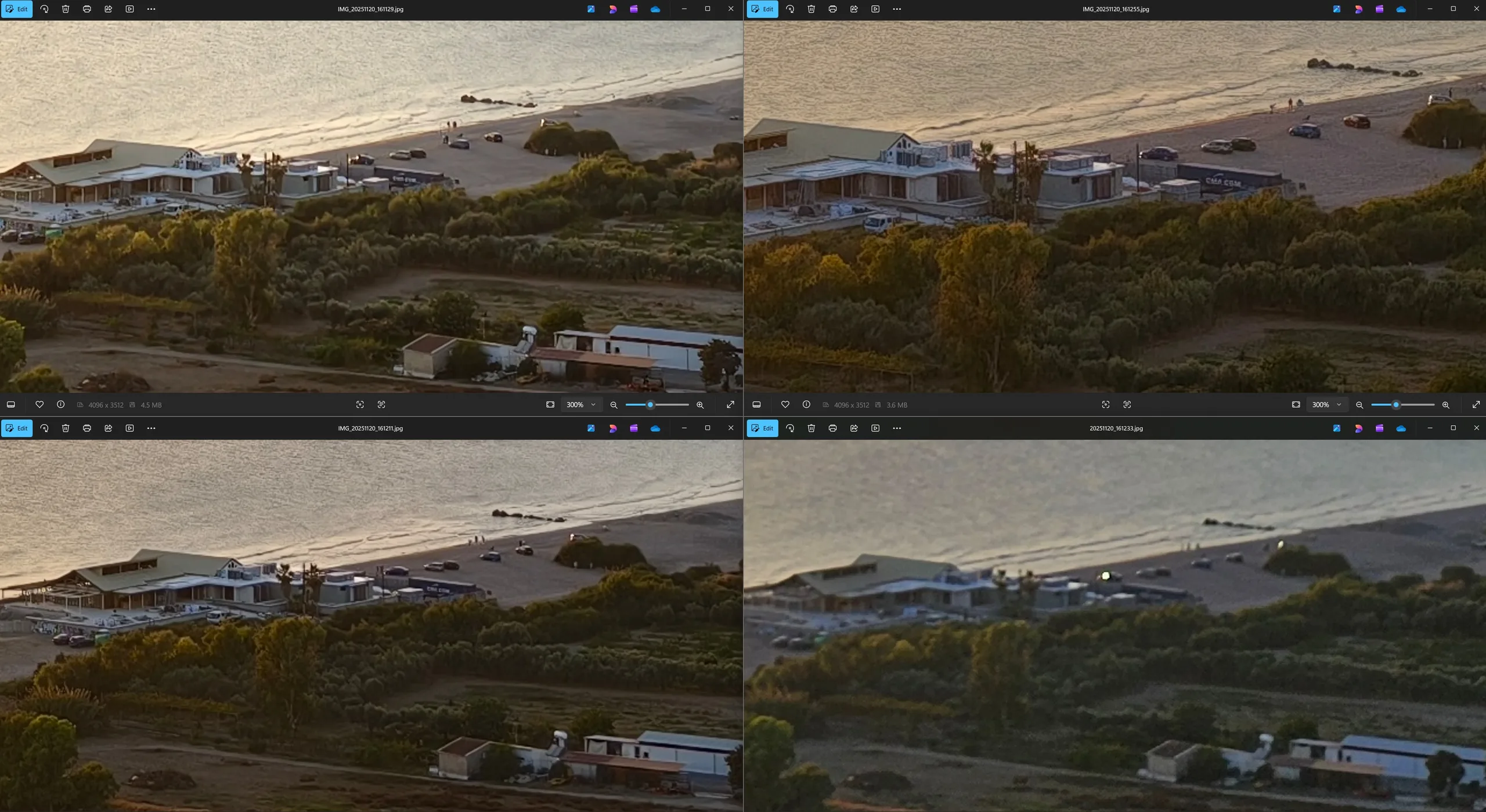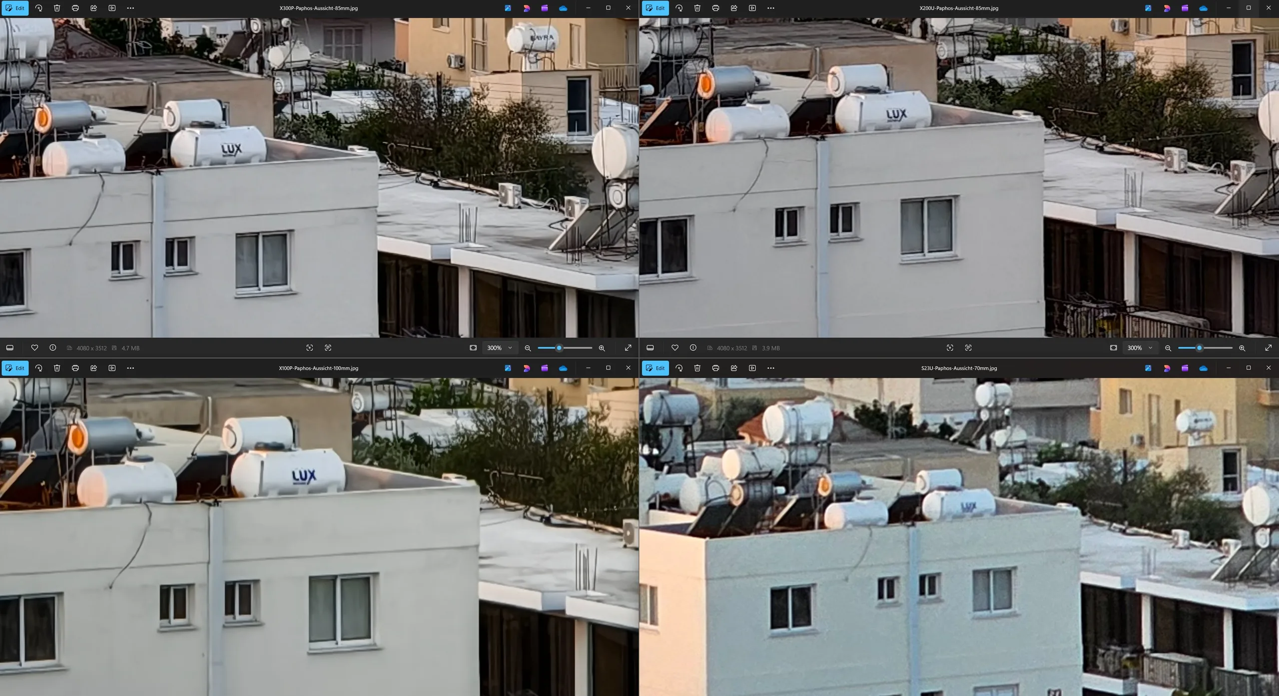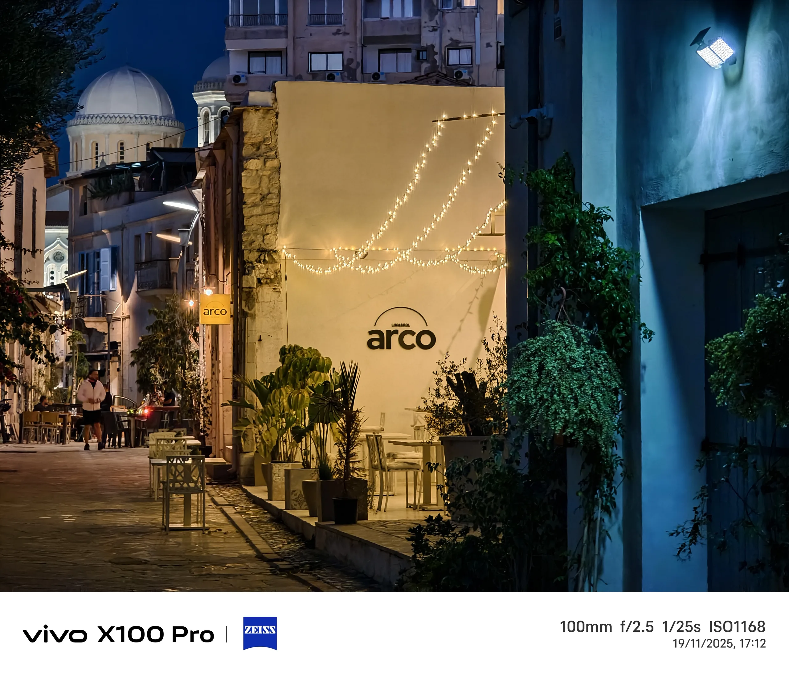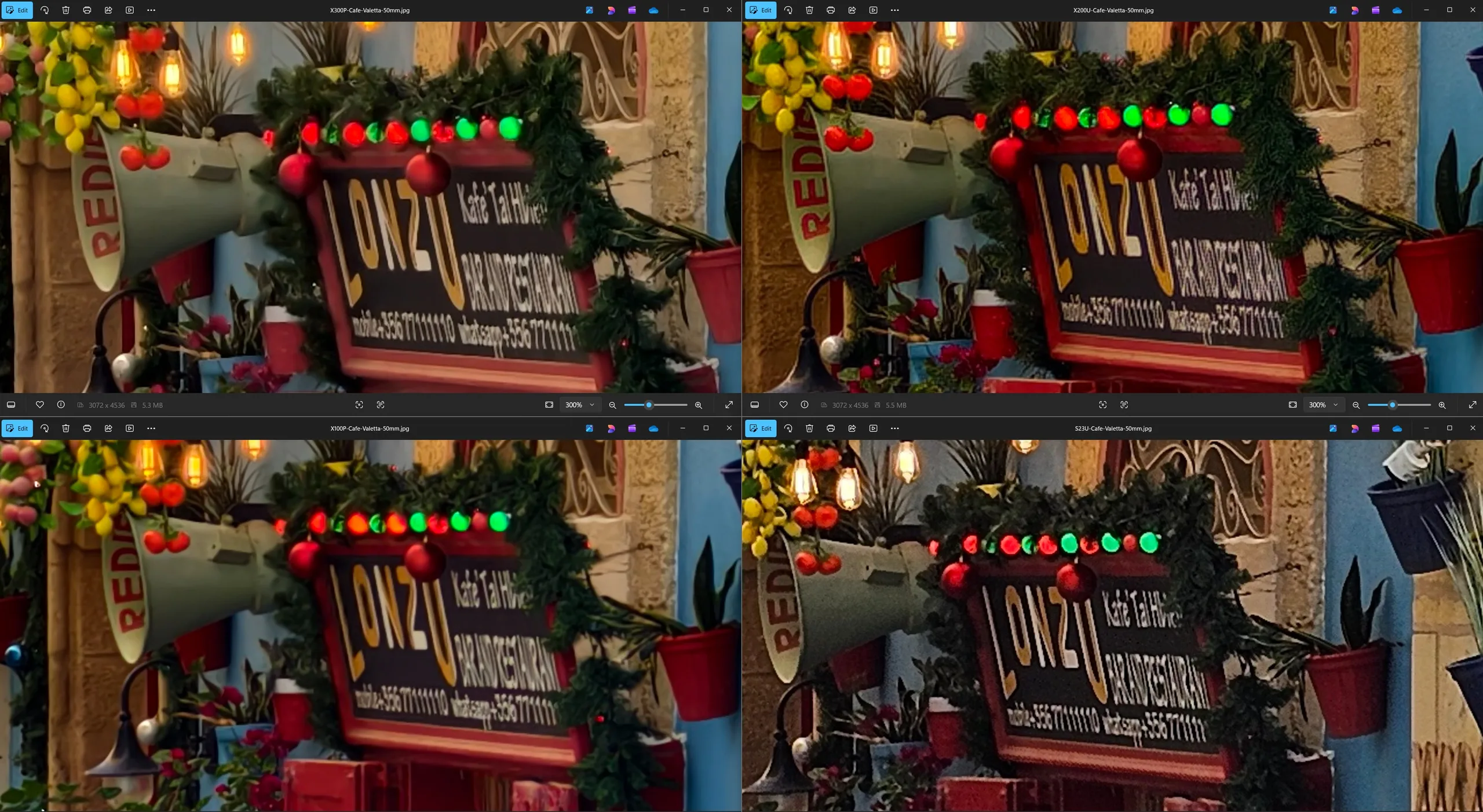 Sin teleconvertidor ni zoom 10x, las cuatro tomas con teleobjetivo realizadas en Limassol muestran de lo que son capaces por la noche, cada una utilizando su distancia focal nativa. El Vivo X300 Pro y el Vivo X200 Ultra están claramente en una liga diferente en la parte superior. Por cierto, la fuente de luz en primer plano era en realidad azul, no blanca, como malinterpreta Samsung la escena. Además, hay una notable falta de detalle en las sombras.
