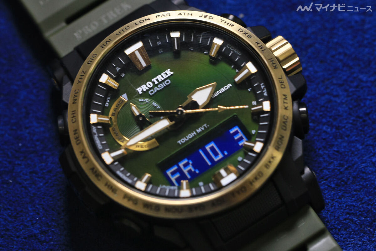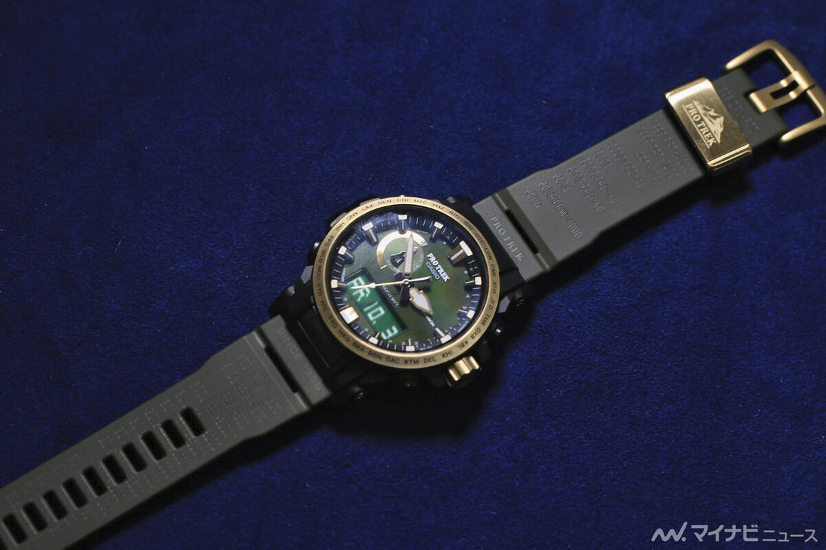 El PRW-61ANS-3, bajo una iluminación más cercana, revela una rica esfera verde oliva con mucha profundidad. Los índices y las manecillas de oro depositado al vapor captan la luz con brillo, lo que a su vez hace que los elementos analógicos resalten sin parecer demasiado reflectantes. Incluso la subesfera digital tiene ahora un aspecto más limpio. Está enmarcada de forma más nítida en la parte inferior de la esfera. También es más fácil distinguir la textura radial bajo el logotipo Pro Trek.