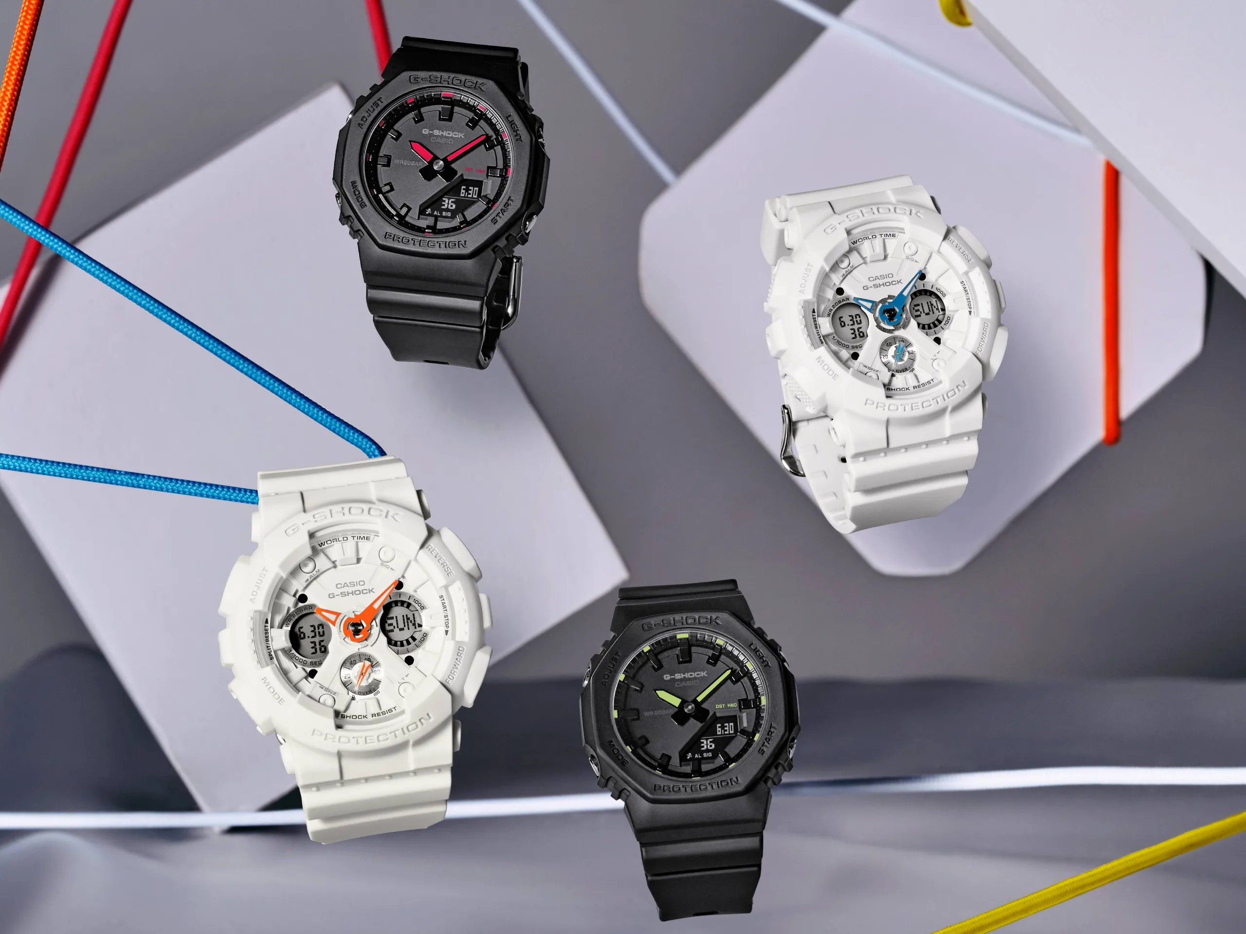 Los GMA-S120SA también son relojes híbridos, aunque cuentan con dos pantallas digitales más pequeñas y una esfera indicadora. Este modelo admite 29 husos horarios mundiales con función de ciudad de origen, y es antimagnético. Entre sus características se incluyen un cronómetro de 1/1.000 segundos, un temporizador de cuenta atrás, cinco alarmas y una retroiluminación LED ámbar. Ambos son relojes completamente blancos con un grueso bisel redondo. Los únicos elementos no blancos son las manecillas del reloj y el indicador de la esfera, que son de color naranja para el GMA-S120SA-7A1 y azul para el GMA-S120SA-7A2.