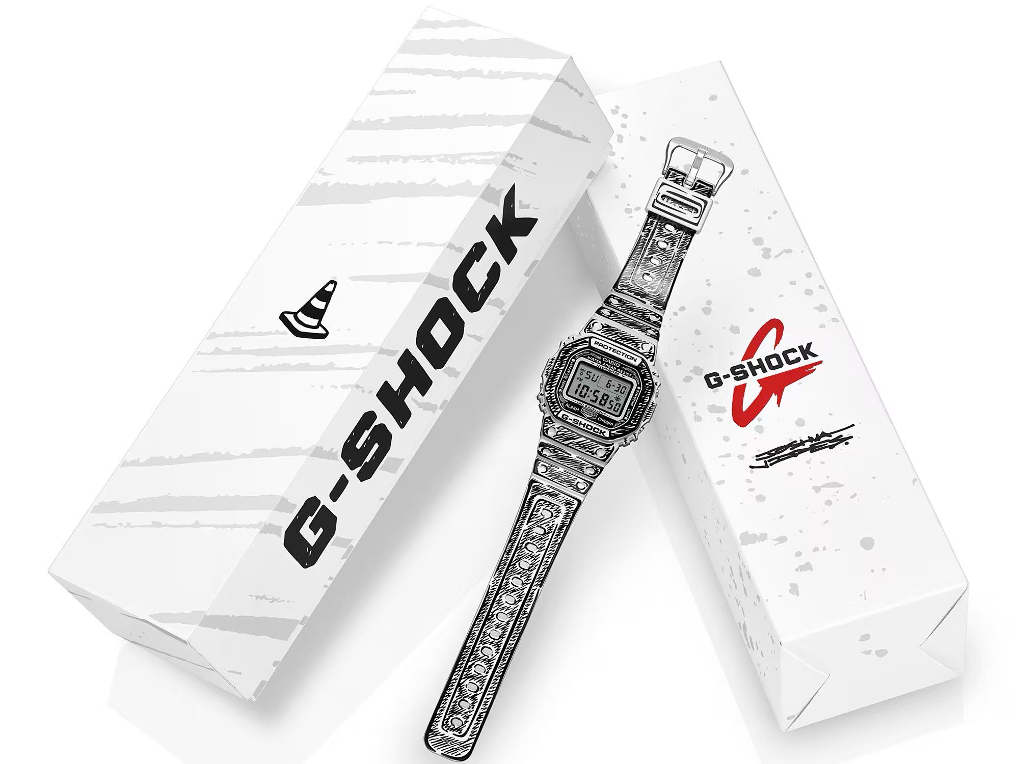 La DW-5600JV-7 presenta una base blanca nítida y brillante que contrasta con unos atrevidos gráficos negros. Este modelo enfatiza la sensación de dibujo a mano, creando una presencia llamativa que parece tinta húmeda sobre papel. Por otro lado, el DW-6900JV-1 presenta un sigiloso acabado negro mate con nítidas rayas blancas. Ambos relojes cuentan con etiquetas de funciones escritas a mano alrededor de la esfera, fondos de caja grabados a medida con la icónica firma del artista y un embalaje personalizado altamente coleccionable. Cuando se activa la retroiluminación LED, el motivo del cono de tráfico característico de Vides ilumina la pantalla.