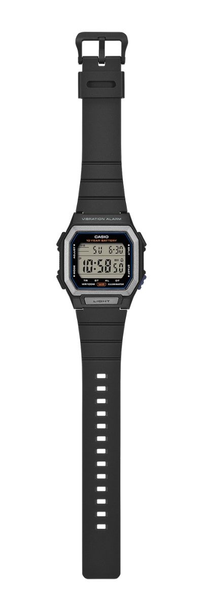 El Casio W-738H tiene una esfera cuadrada y la pantalla digital muestra la hora en formatos de 12 o 24 horas. El modelo también puede mostrar información sobre la fecha y el día de la semana, y admite dos husos horarios. Dispone de herramientas como un cronómetro preciso, un temporizador de cuenta atrás con un intervalo de 24 horas, una alarma diaria y señales horarias. Además, los usuarios pueden recibir alertas por vibración vinculadas a estas funciones.