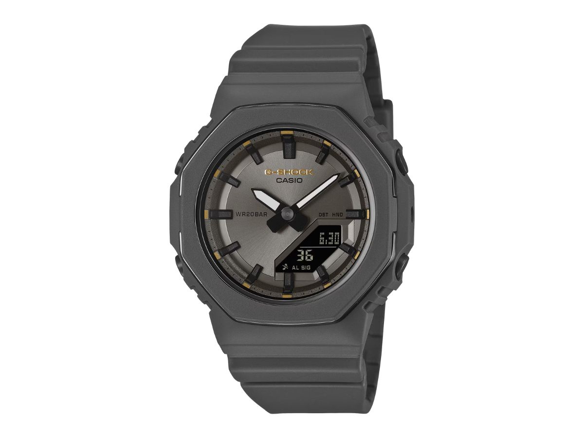 El G-Shock GMAP2126W-8A de Casio es un reloj analógico-digital con dos agujas analógicas engarzadas en una esfera metálica de color gris oscuro con toques dorados. Se dice que mantiene una precisión de 15 segundos al mes, y una función de desplazamiento de manecillas garantiza que la pantalla digital insertada nunca quede oscurecida. La pantalla muestra información sobre la fecha y el día de la semana. Además, este modelo ofrece herramientas como un temporizador de cuenta atrás, un cronómetro de 1/100 de segundo, alarmas y señales horarias. Los usuarios pueden elegir entre una lista de 48 ciudades para ajustar la zona horaria. También cabe destacar que el modelo es resistente al agua hasta 200 m.