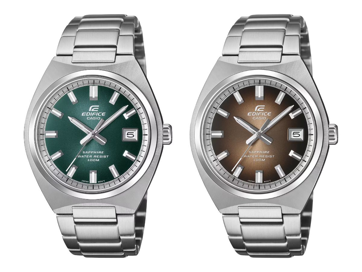 Mientras que el EFB-109D-3AV tiene una esfera degradada en azul y verde, el EFB-109D-5AV tiene una esfera marrón del mismo estilo. Ambos tienen agujas e índices de color plateado, con un bisel metálico con acabado de espejo a juego. Está rodeado por una carcasa de acero inoxidable con un diseño de líneas capilares y va acompañado de un brazalete. Además, cada uno cuenta con un cristal de zafiro y un fondo con cierre de rosca. Tienen un perfil relativamente delgado, con unas medidas de 43,5 x 38,5 x 9,2 mm (~1,71 x 1,52 x 0,36 pulgadas).
