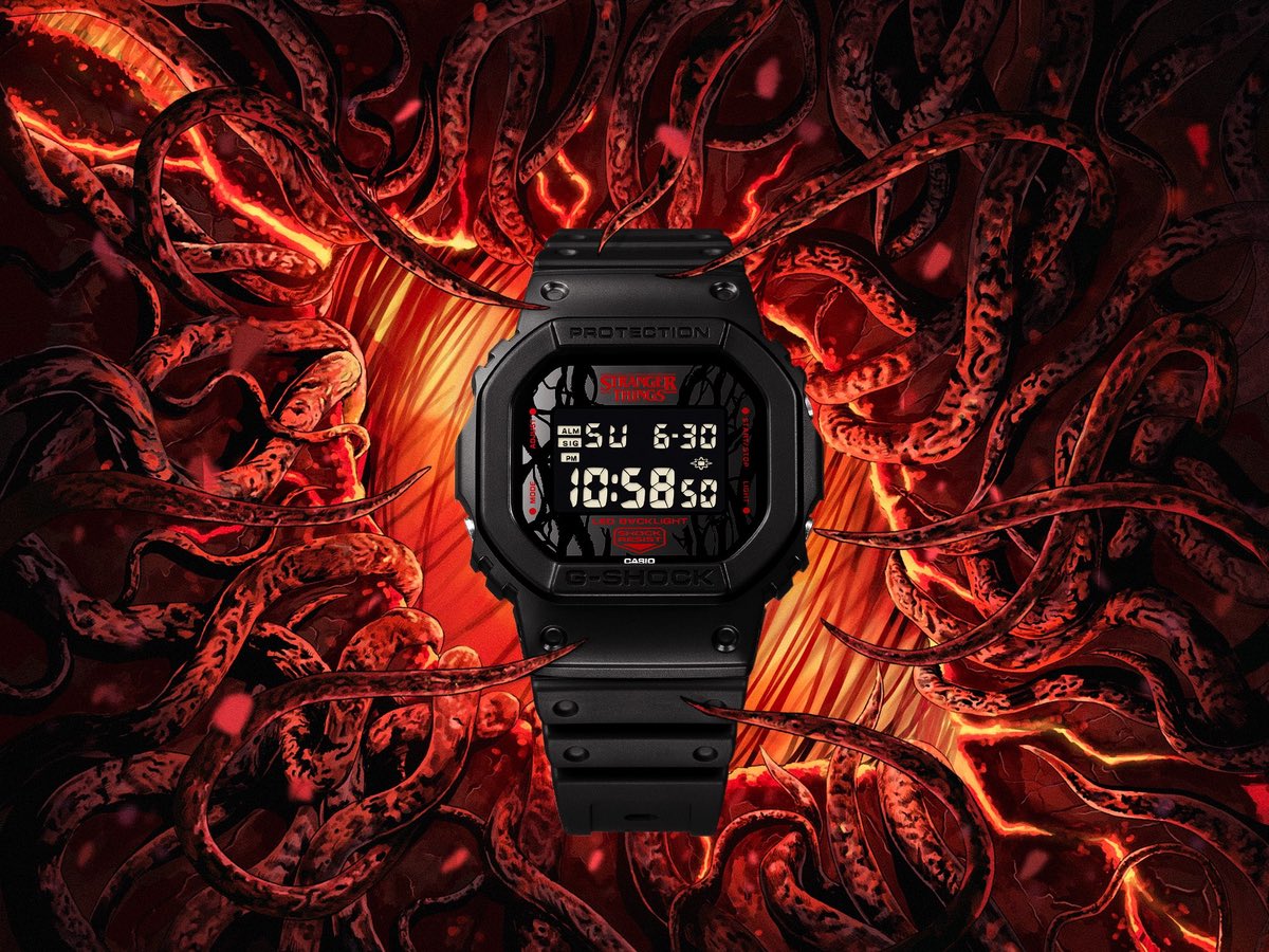 El G-Shock DW-5600STT-1JR se envía en una caja temática especial que incluye ilustraciones cubiertas de vid e imágenes del Demogorgon, uno de los monstruos más reconocibles de la serie.