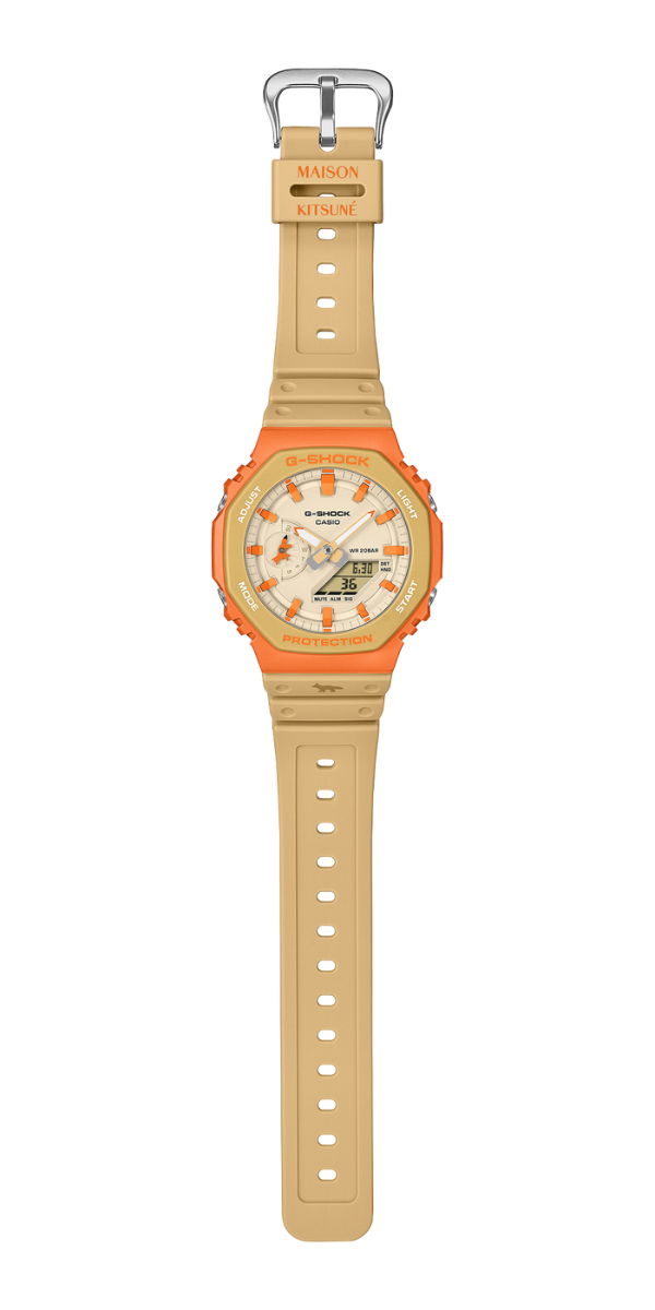 El Casio G-Shock GA-2110MK-5A tiene una paleta camaieu, o monocroma, que se dice inspirada en la arquitectura parisina de Haussmann. El diseño gira en torno al motivo del zorro de la Maison Kitsuné, que se encuentra en la subesfera del día de la semana. En un naranja brillante a juego están el bisel del reloj y varios acentos en la esfera más clara. El reloj de resina mide 48,5 x 45,4 x 11,8 mm (~1,91 x 1,79 x 0,46 pulgadas), con un llamativo bisel naranja, y la correa lleva el logotipo de la Maison Kitsuné.