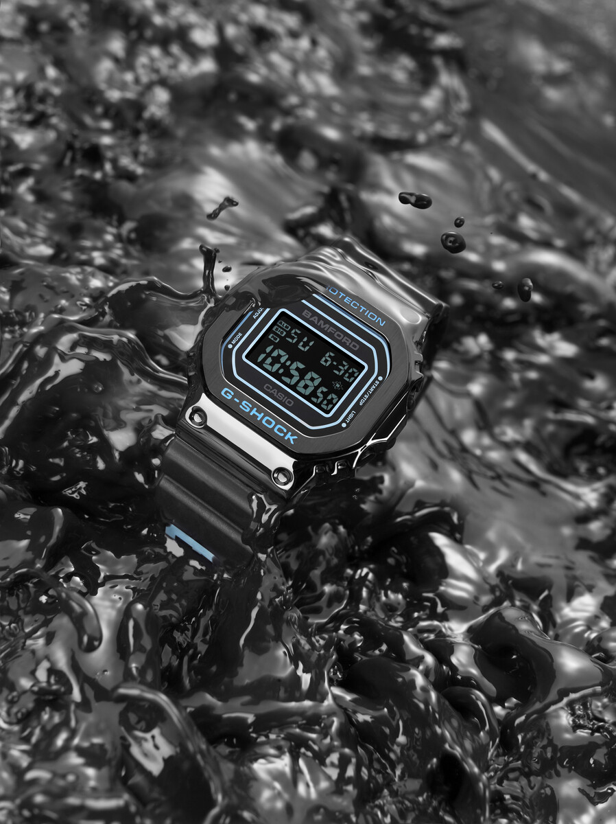 Aunque el anuncio original se centraba en lo básico - un acabado negro pulido, pantalla LCD en negativo y los característicos detalles en azul claro de Bamford - estas nuevas imágenes nos dan una idea algo mejor de la personalidad del reloj. Una espectacular toma del producto sitúa el GM-5600 en un espeso líquido negro. Otra toma capta el reloj aparentemente derritiéndose o goteando, exhibiendo el brillo de su lustroso exterior. Ambas imágenes muestran el contraste estético entre la marca Bamford mate de la correa y la caja de metal pulido.