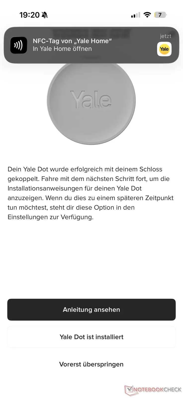 Para abrir o cerrar la Linus Smart Lock L2 Lite después de haber configurado el Yale Dot a través de la aplicación, basta con acercar el smartphone al pequeño disco de plástico. Aparece una pequeña ventana de notificación en la parte superior de la pantalla (probado en un iPhone 16 Pro), que abre o cierra la cerradura al tocarla (dependiendo del estado).