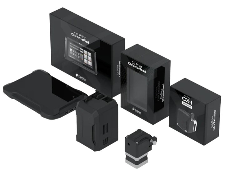 Dependiendo de la impresora 3D concreta que se utilice, se necesitan distintos dispositivos. Cuando se utiliza una impresora basada en Klipper, no es necesario utilizar adicionalmente la consola de control CromaPad. La ChromaPad controla entonces el extrusor CX-1, y ChromaScreen proporciona además un software de código abierto especialmente potente. Incluso debería ser posible controlar hasta ocho impresoras simultáneamente a través del ChromaPad, lo que también debería ser relevante para los proveedores comerciales.