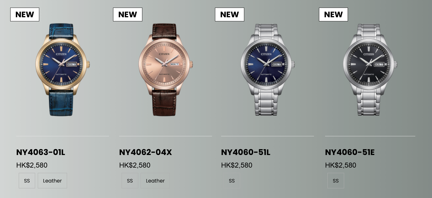 Las diferencias radican principalmente en el acabado y las opciones de correa. Tanto el NY4060-51L como el NY4060-51E utilizan brazaletes de acero inoxidable, con el primero emparejado a una esfera azul y el segundo a una esfera negra. Estas versiones con brazalete pesan 132 g. El NY4063-01L y el NY4062-04X cambian a correas de piel, reduciendo el peso a 70 g. El NY4063-01L utiliza una esfera azul con la superficie de la caja chapada en oro rosa y una correa de piel azul, mientras que el NY4062-04X presenta una caja chapada en oro rosa con una correa de piel marrón y el tono de la esfera a juego.