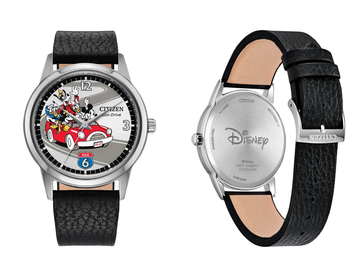 La esfera del Citizen FE7110-09W presenta una imagen retro de los personajes de Disney Mickey Mouse, Minnie Mouse, el Pato Donald, el Pato Daisy, Goofy y Pluto. Todos ellos están sentados en un coche rojo, supuestamente en un viaje por carretera en Estados Unidos. La esfera pictórica tiene índices plateados sobre un fondo anular negro, y está rodeada por una caja de acero inoxidable en tono plateado de 40 mm (~1,57 pulgadas) de ancho. El reloj va acompañado de una correa de cuero negro texturizado, con un cierre a juego de color plateado.