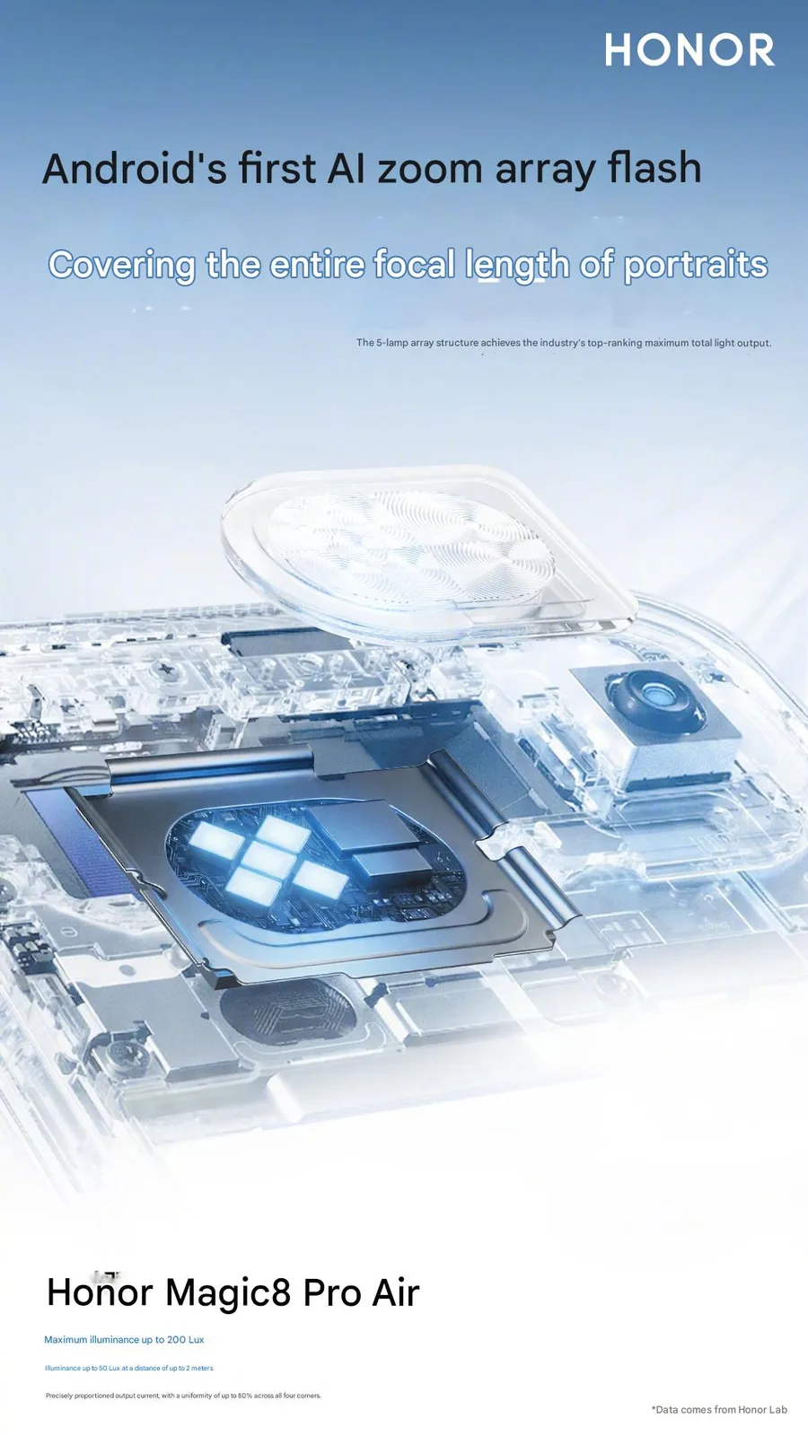 Múltiples teasers nuevos confirmaron además algunas especificaciones de la cámara filtradas previamente, como el sensor de 50MP para la cámara principal, que es bastante grande con 1/1,3 pulgadas y una apertura de f/1,6. Lo mismo puede decirse de la cámara con teleobjetivo periscópico de 3,2x, que según Honor es la más delgada del sector y cuenta con un sensor de 64MP de 1/2 pulgada y una apertura de f/2,6. También se anuncia un flash con zoom AI, diseñado para cubrir todas las distancias focales de retrato y alcanzar hasta 200 lux o 50 lux a una distancia de 2 metros o 6,6 pies.