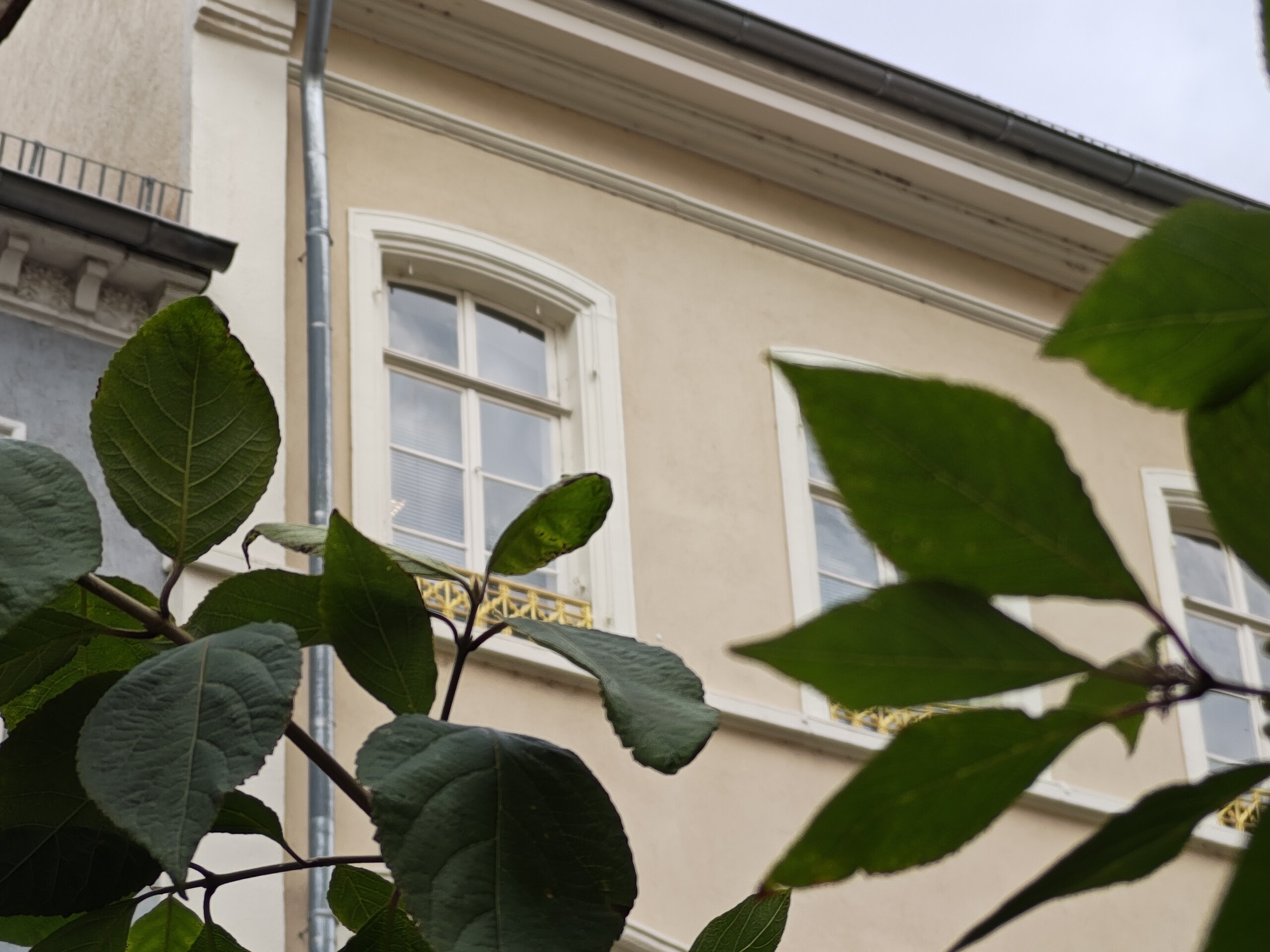 Continuamos nuestro paseo y nos encontramos con el histórico ayuntamiento a la izquierda. Así que hicimos otra foto, y la cámara del teléfono plegable Samsung resultó ser más impresionante: la palmera del primer plano aparecía mucho más detallada, y los rasgos de la fachada del ayuntamiento eran más nítidos. En general, la imagen también parecía más nítida.