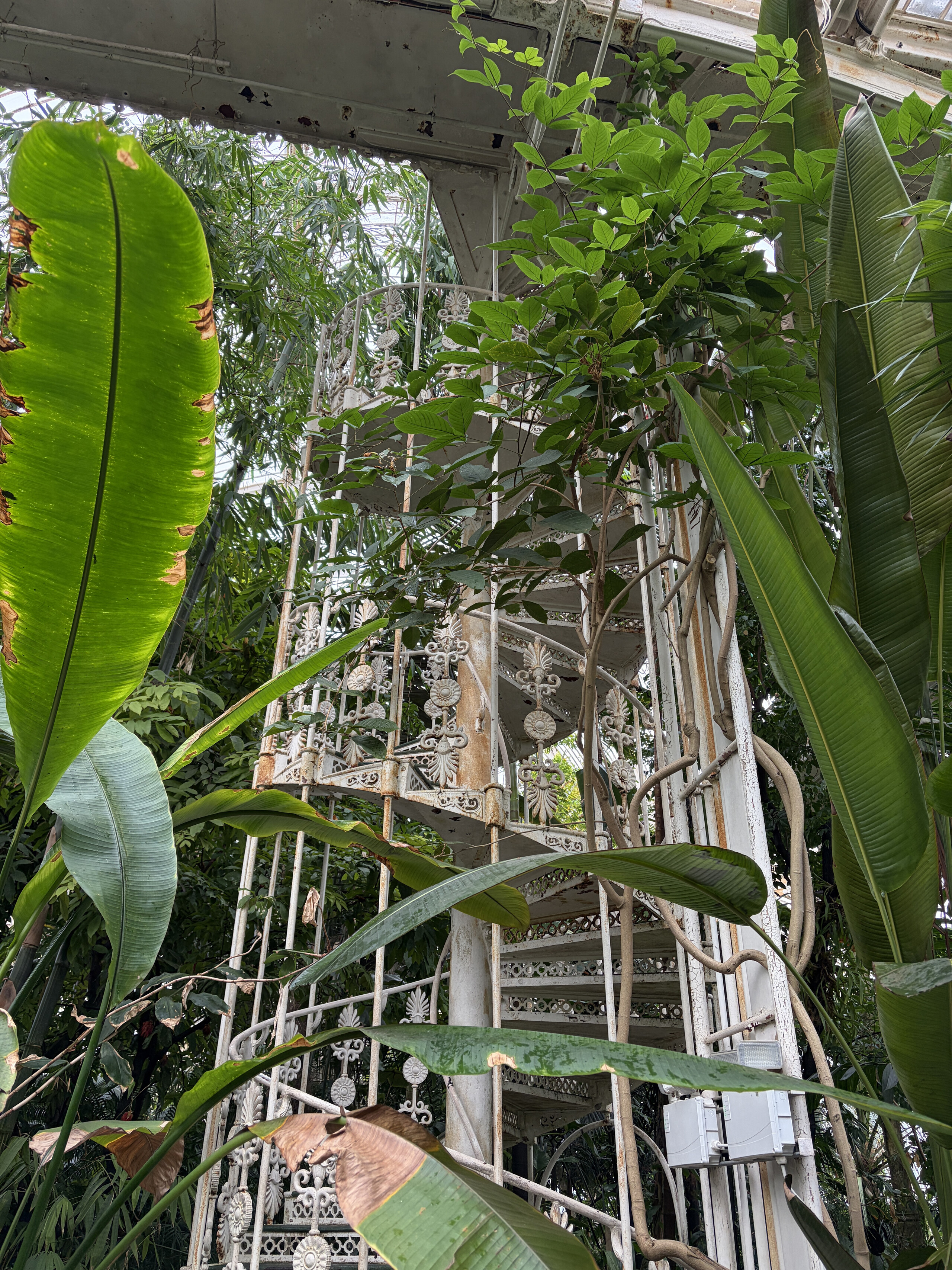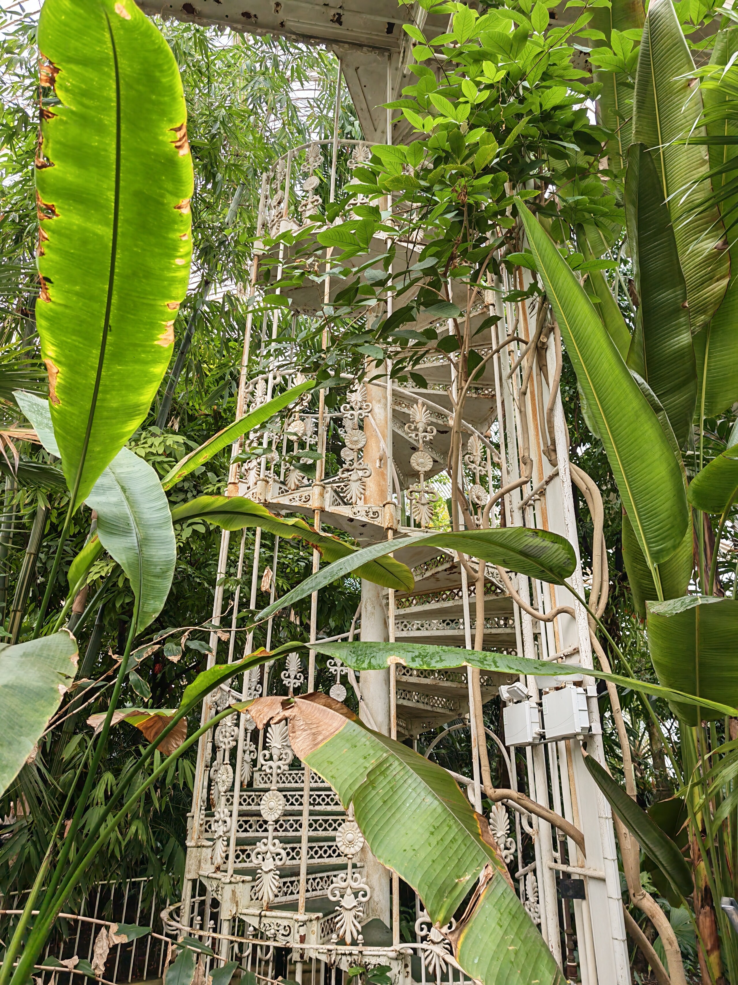 En la Casa de las Palmeras, unas escaleras de hierro conducen a una pasarela que ofrece una vista desde lo alto de la exuberante vegetación tropical. Aquí, también, la foto del teléfono Honor parece más rica en contraste, pero el iPhone vuelve a ganar en términos de detalle y nitidez.